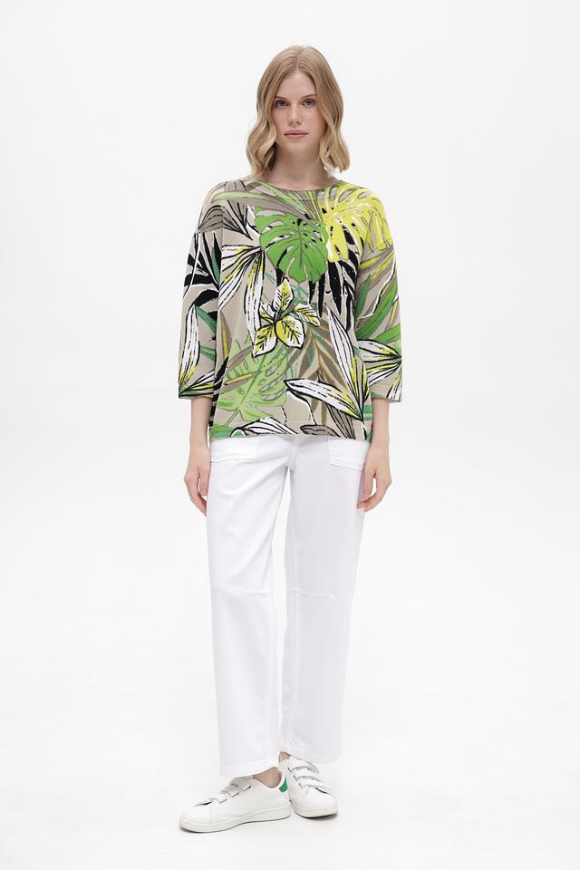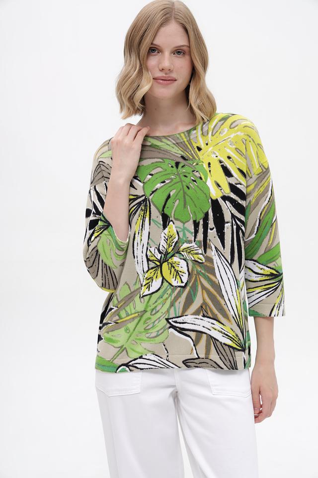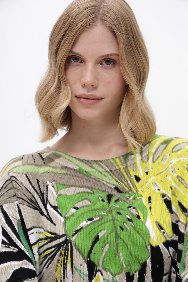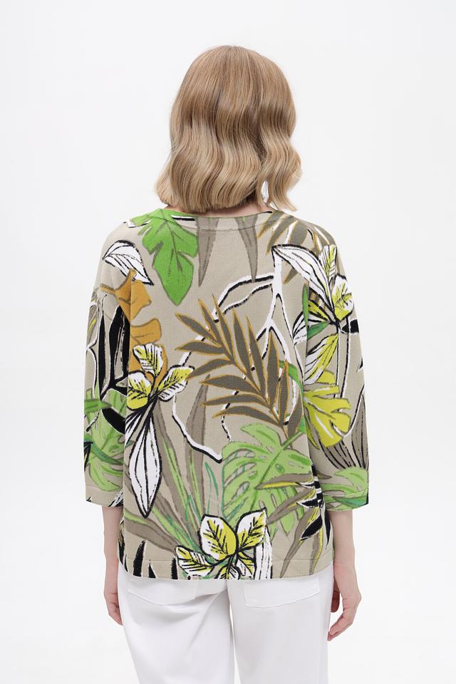 Модель имеет свободный крой и длину до бедер, что делает ее универсальной для создания различных образов. Пуловер украшен ярким и красочным тропическим принтом, который добавит вашему образу свежести и оригинальности.