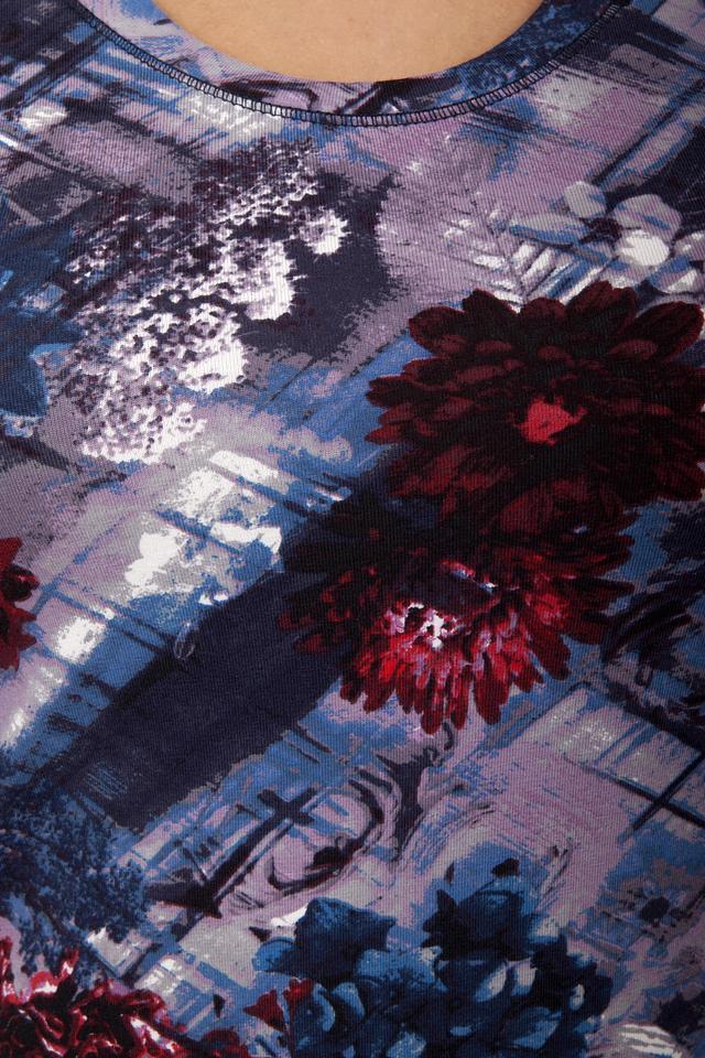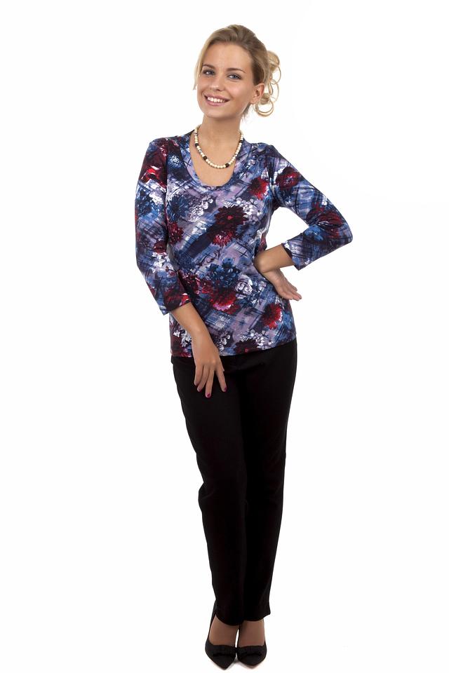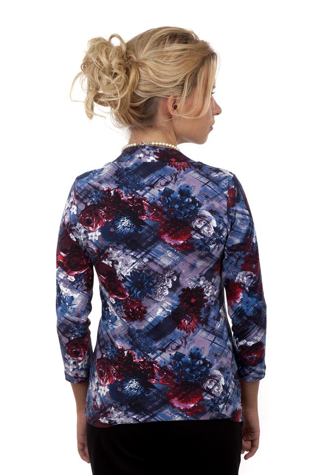 Основной цвет блузы – синий, но она украшена ярким и красочным цветочным принтом, в котором преобладают оттенки красного, бордового и белого. Принт выполнен в абстрактном стиле, что придает блузе оригинальность и неповторимость.