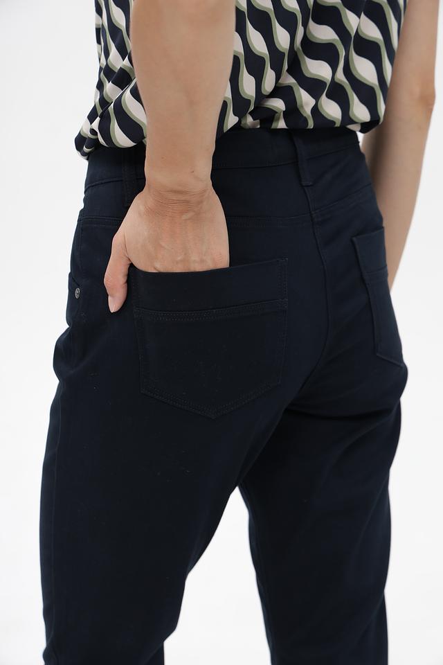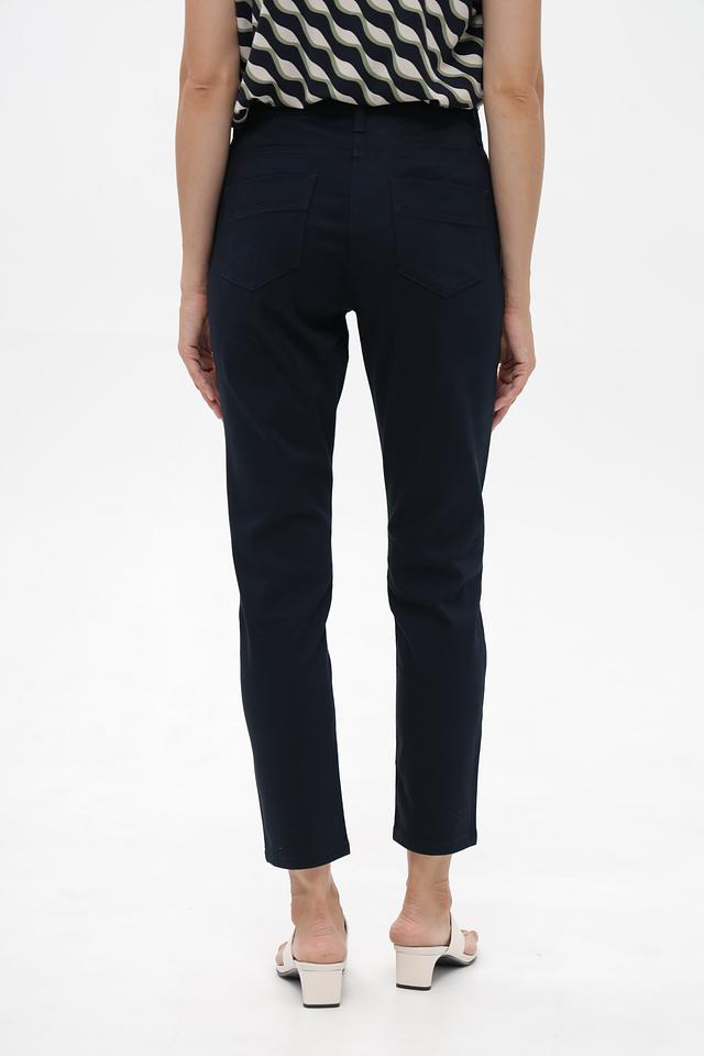 Брюки имеют прямой крой и стандартную посадку по талии. Тёмно-синий цвет делает их универсальными и легко сочетаемыми с различными элементами одежды. Модель дополнена функциональными карманами.