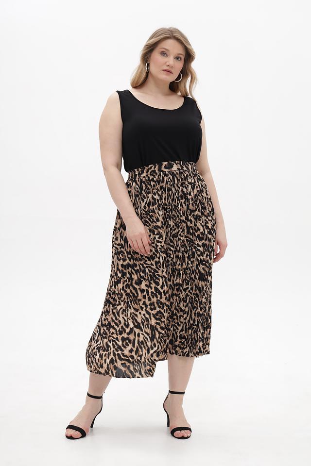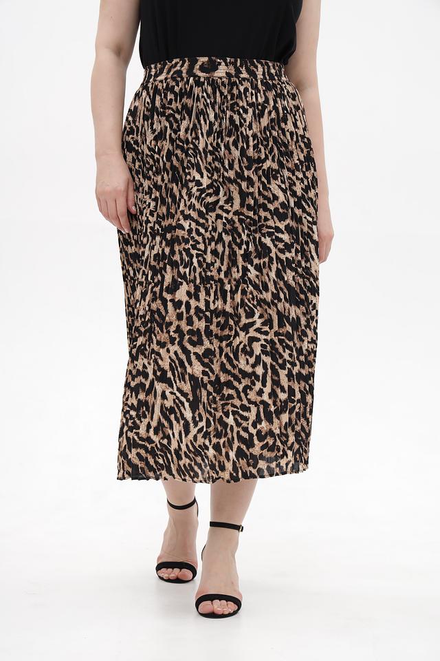 Юбка имеет плиссированную фактуру и длину миди, обеспечивая свободу движений и комфорт в носке. Эластичный пояс гарантирует идеальную посадку по фигуре.