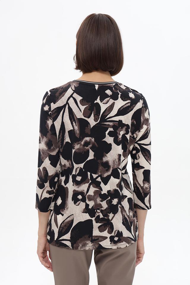 Блуза имеет круглый вырез горловины и рукава длиной 3/4, что делает ее универсальной для разных сезонов. Свободный крой обеспечивает комфорт в носке и позволяет создать расслабленный силуэт.