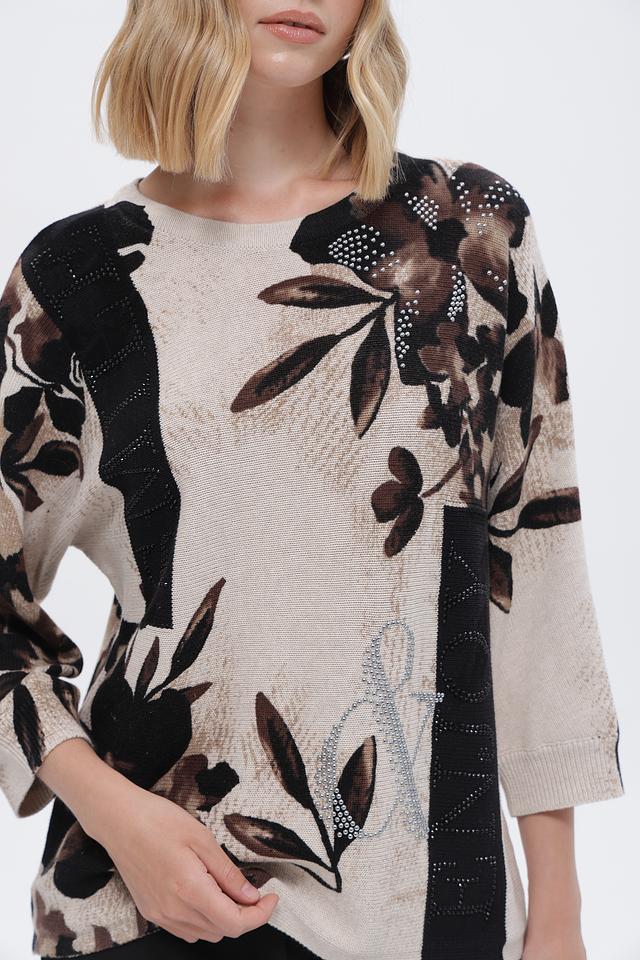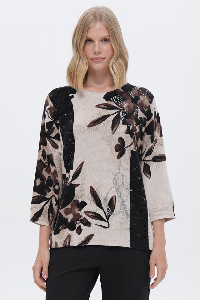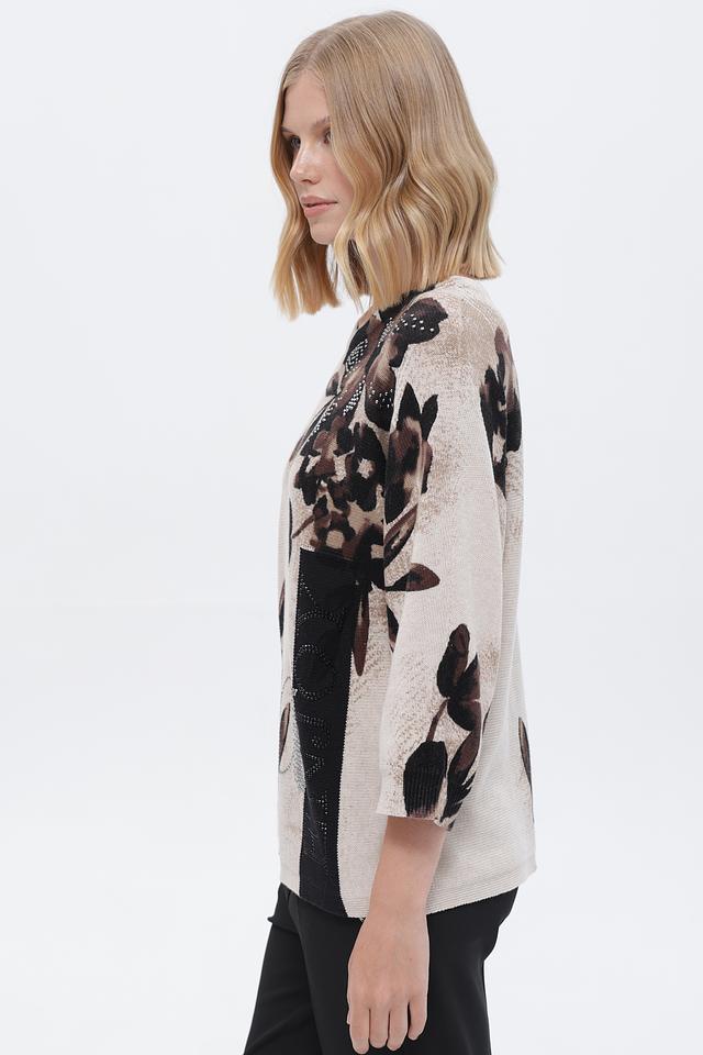 Бежевый пуловер Betty Barclay с оригинальным цветочным принтом и декоративной отделкой из страз. Изготовлен из мягкого трикотажа, обеспечивающего комфорт и удобство. Идеальный выбор для создания элегантного повседневного образа. Состав: хлопок 100%