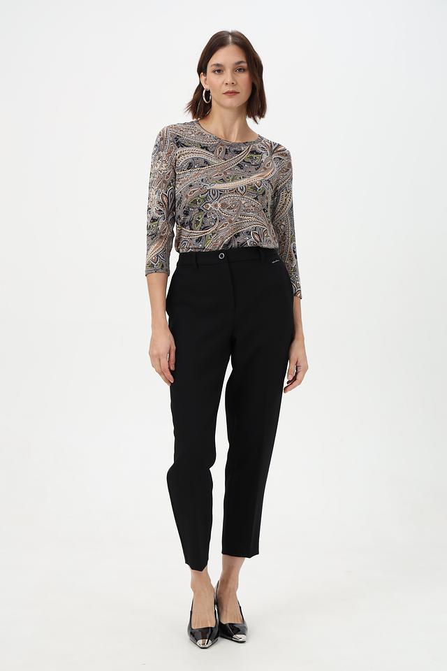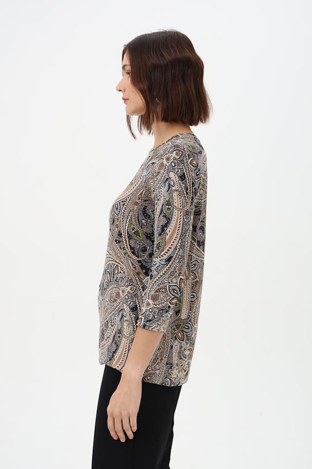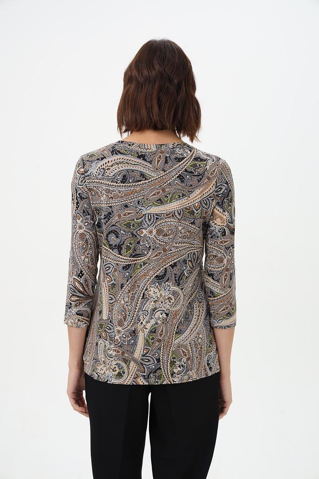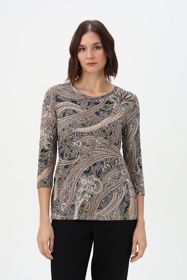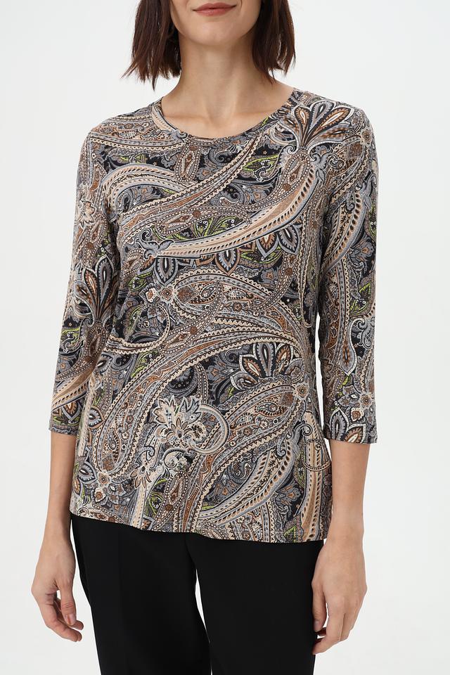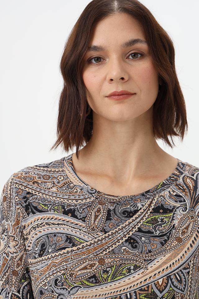 Особенность этой модели – яркий и запоминающийся принт пейсли, выполненный в сочетании серых, коричневых и бежевых оттенков. Состав ткани: 95% вискоза, 5% эластан.