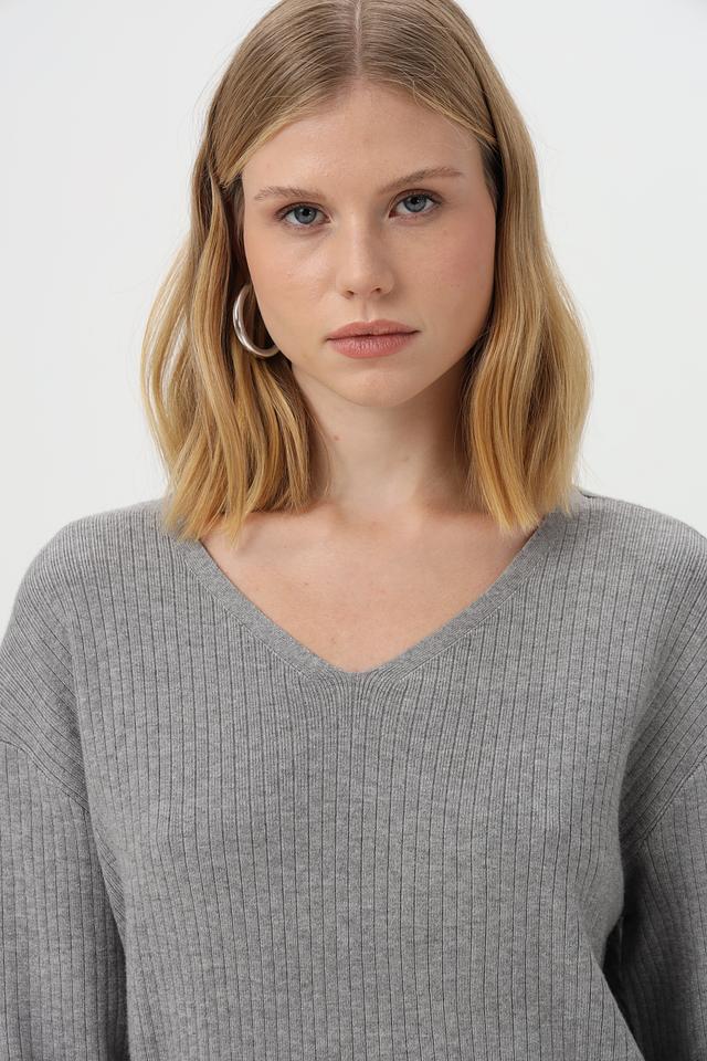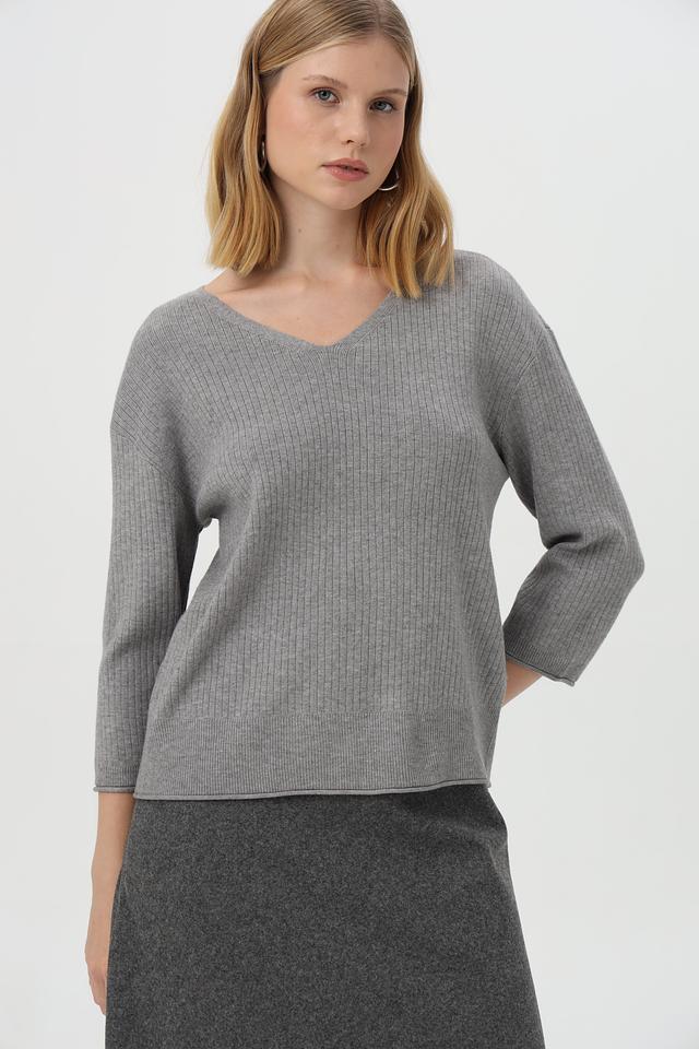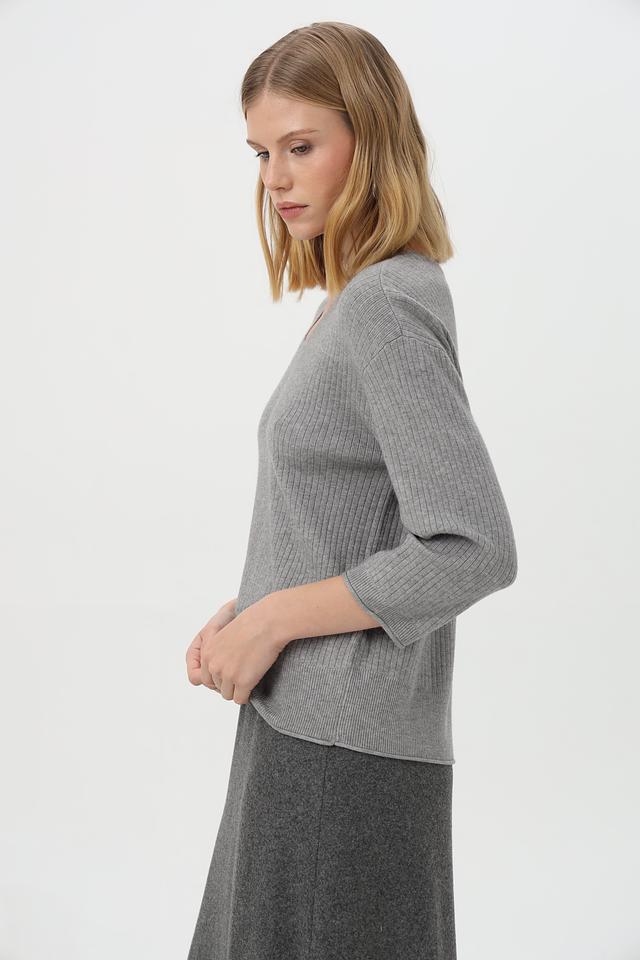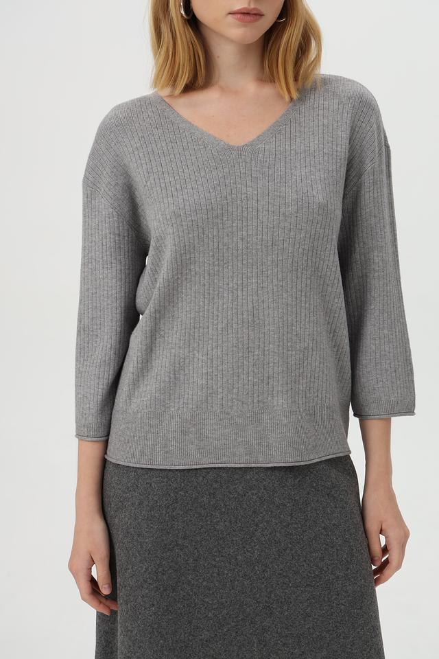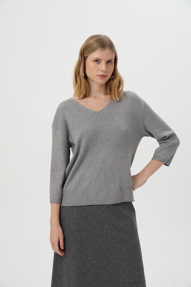 Пуловер имеет V-образный вырез, который визуально удлиняет шею и делает образ более изящным. Рукав три четверти добавляет женственности и подходит для любого времени года.
