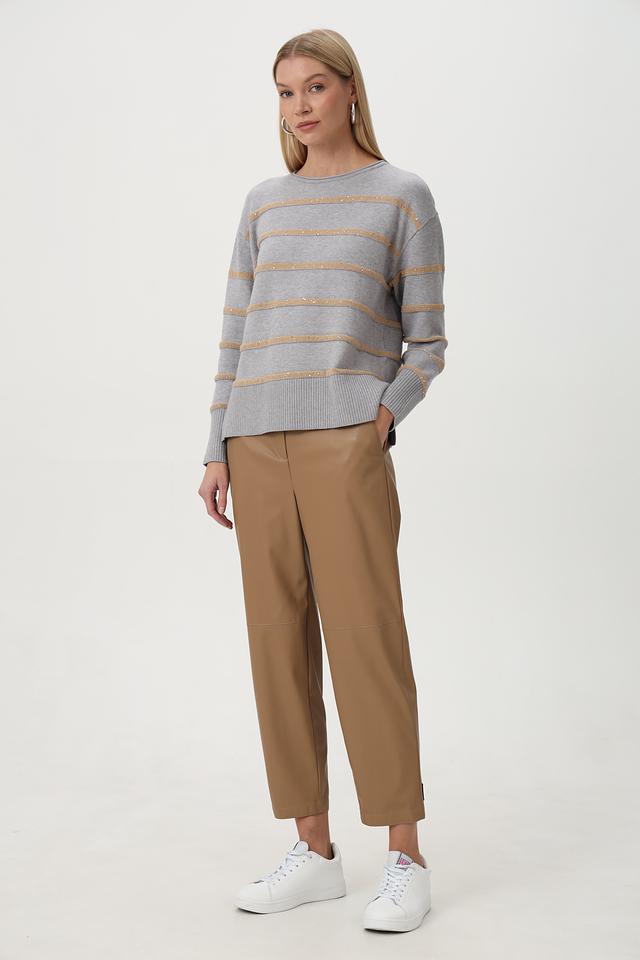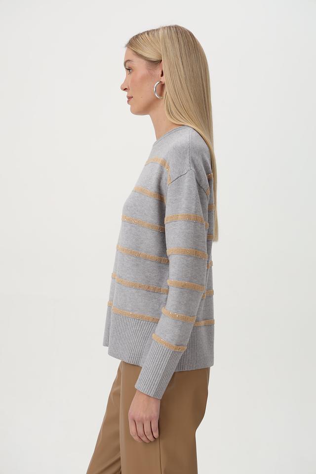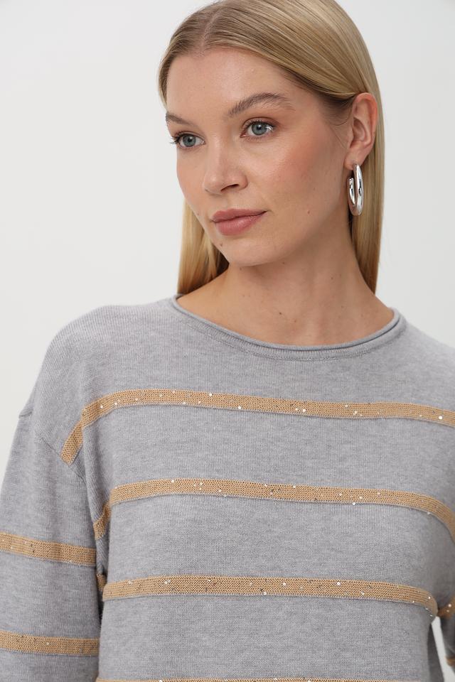 Пуловер имеет прямой крой и длинные рукава, а также круглый вырез горловины. Особый акцент сделан на горизонтальные полоски, которые украшены золотистой отделкой, придающей изделию изысканность и блеск.
