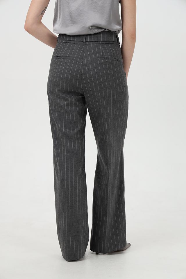 Брюки имеют высокую посадку, прямой крой и слегка расклешенный силуэт книзу. Застежка на пуговицу и молнию, а также наличие боковых карманов делают модель практичной и функциональной.