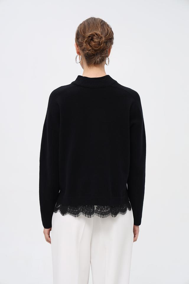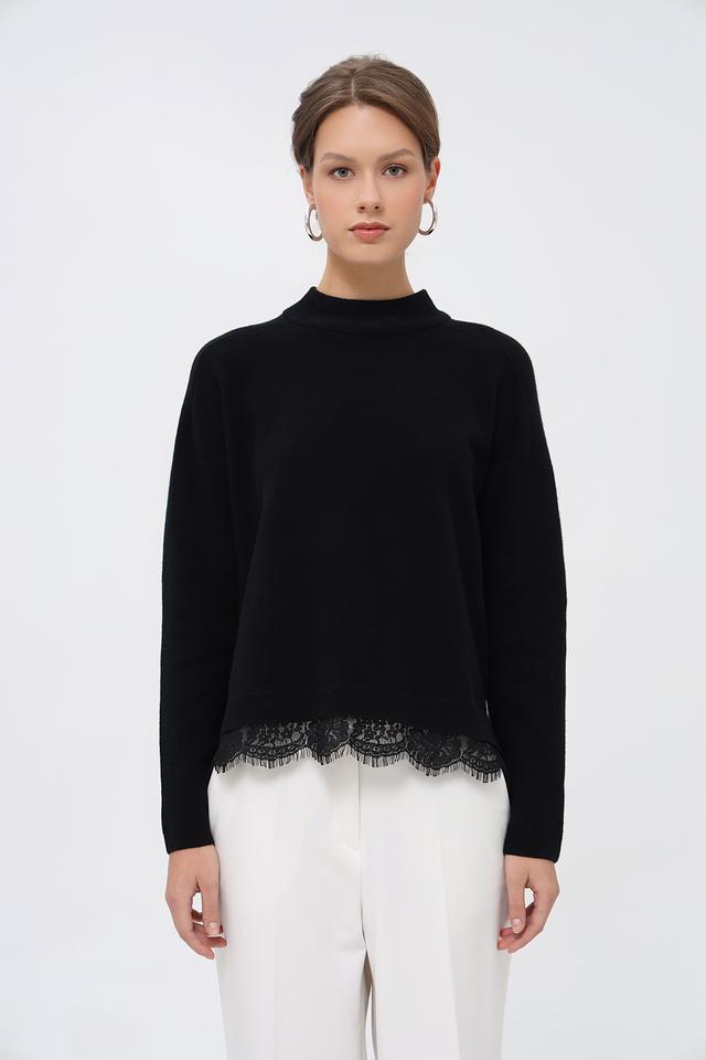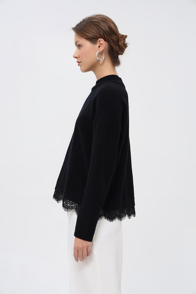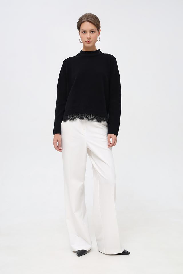 Пуловер имеет классический крой с высоким воротником и длинными рукавами. Особый шарм изделию придаёт изящная отделка из чёрного кружева по нижнему краю.
