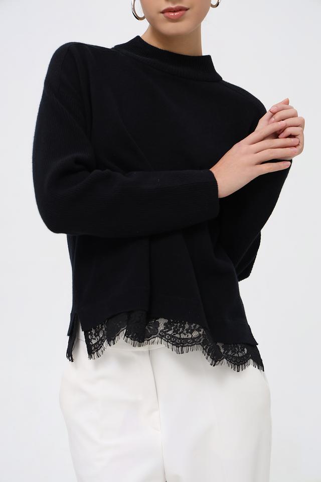 Чёрный пуловер от Betty Barclay с изящной отделкой из кружева. Модель выполнена из мягкого трикотажа, в составе хлопок, полиамид и эластан. Идеально сочетается с брюками и юбками. Состав: хлопок 62%, полиамид 35%, эластан 3%