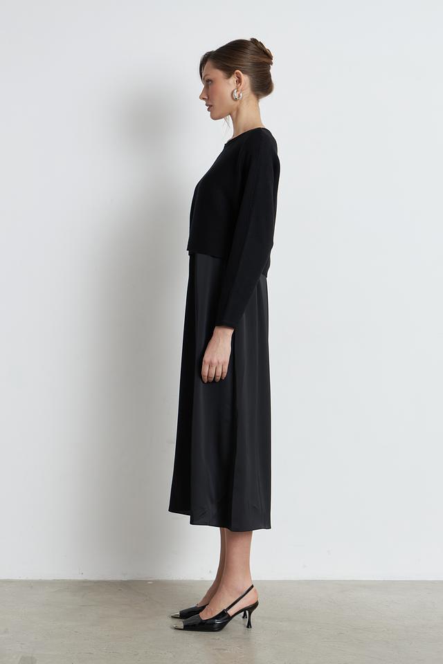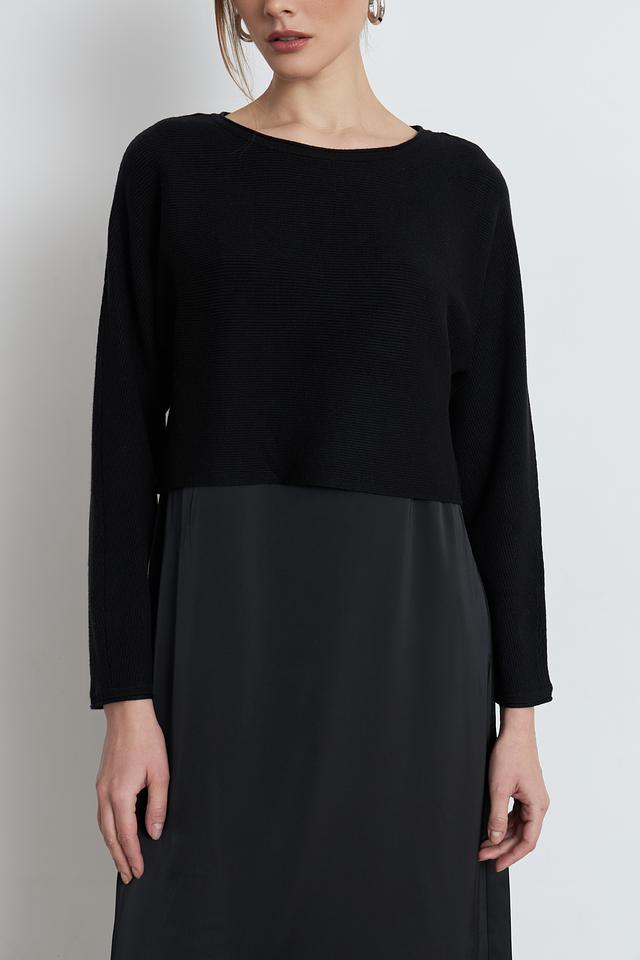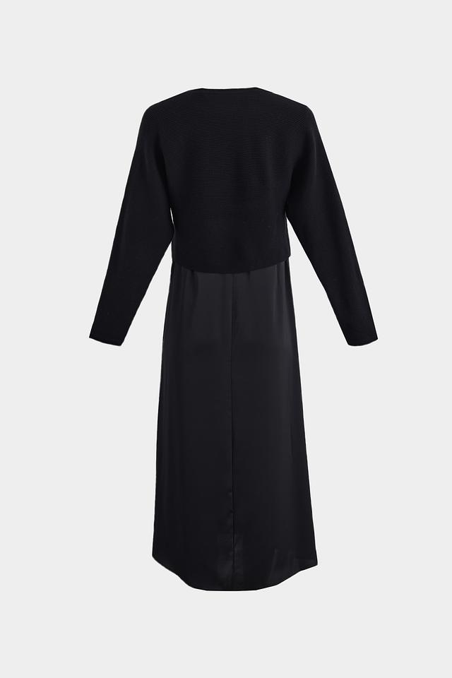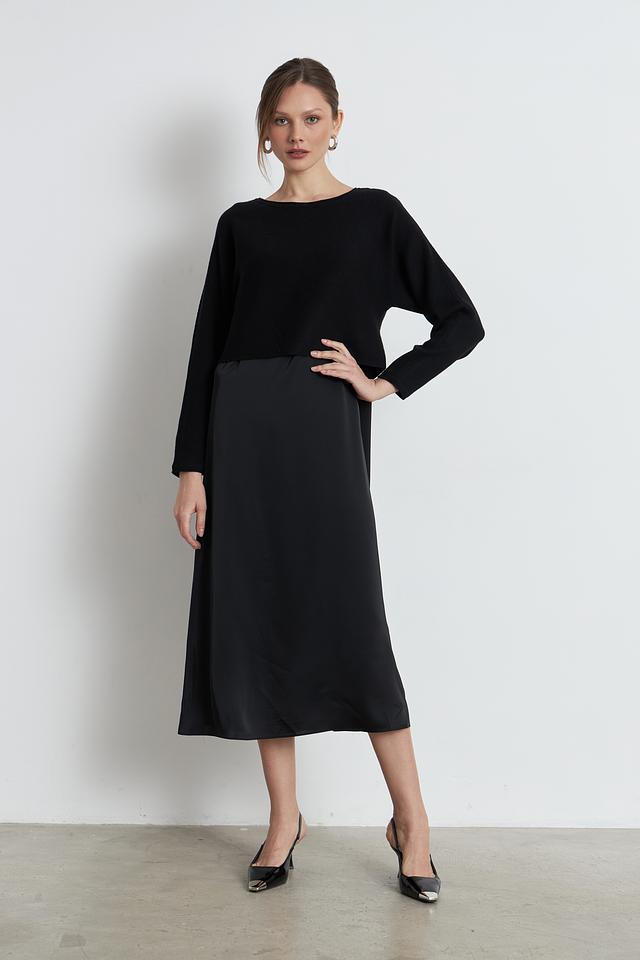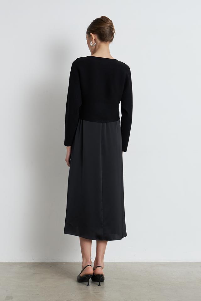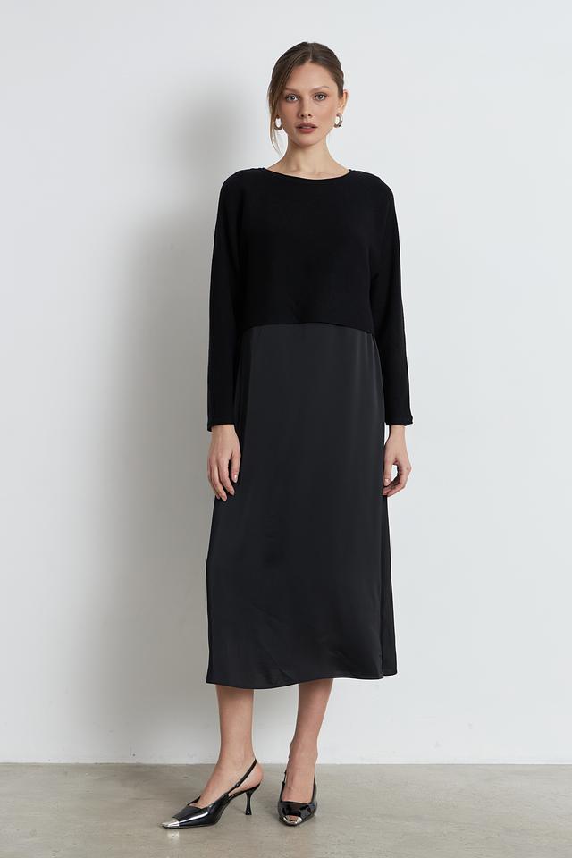 Это стильное платье от Betty Barclay сочетает в себе комфорт и элегантность. Верхняя часть платья выполнена из мягкого чёрного трикотажа, а юбка – из гладкой ткани, создавая интересный контраст фактур.