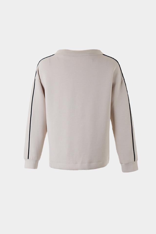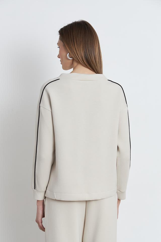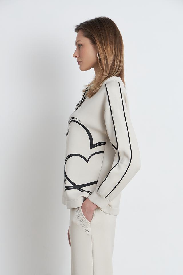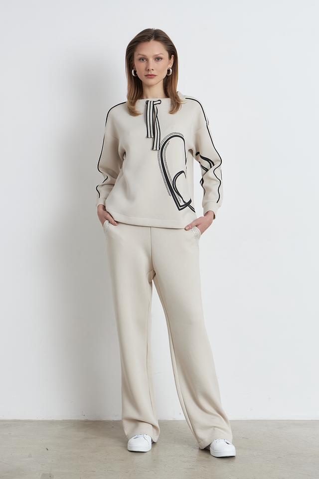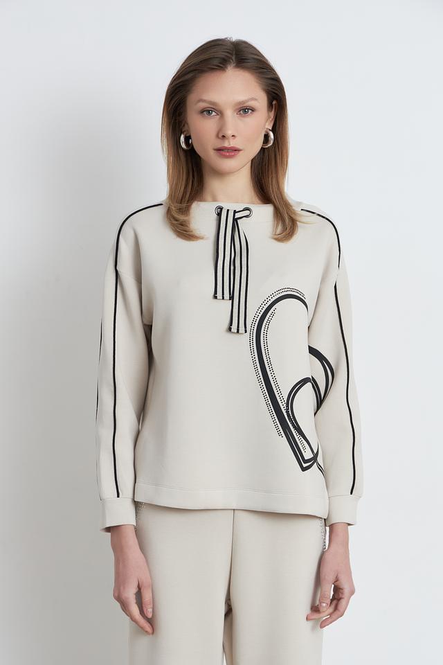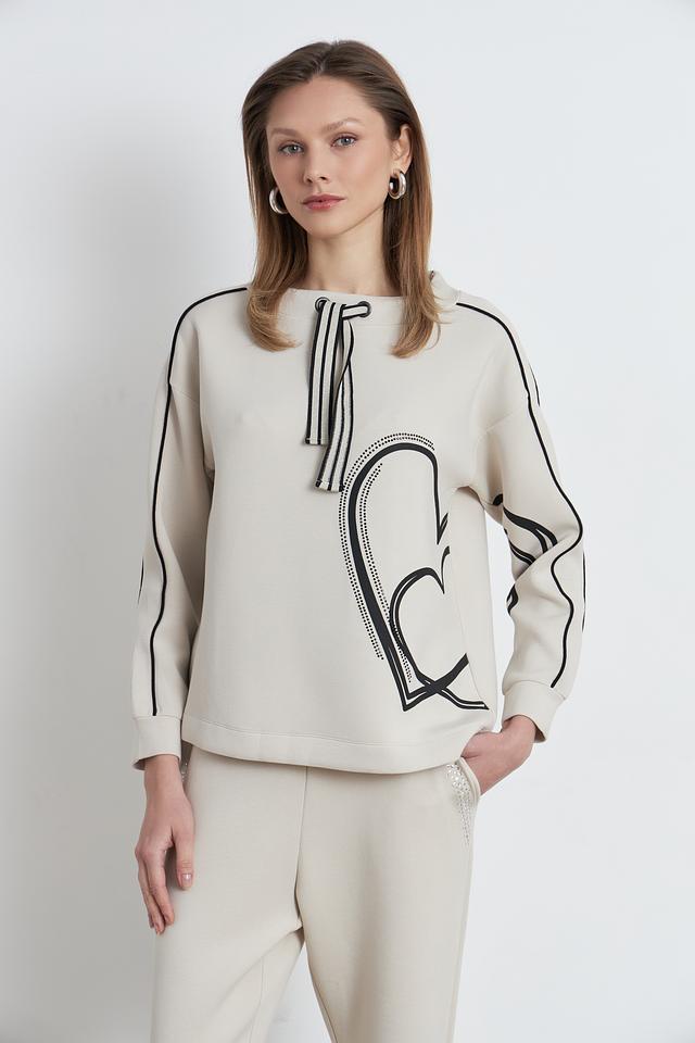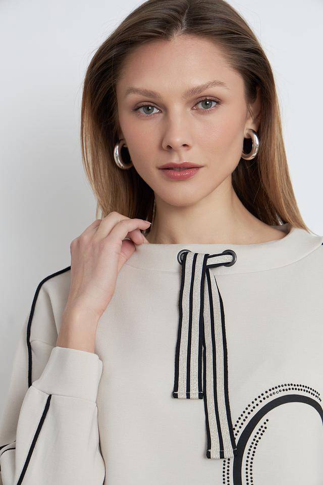 Пуловер имеет бежевый цвет и украшен оригинальным графичным рисунком в чёрном цвете. Декор выполнен в виде абстрактных линий и фигур, что придает изделию современный и модный вид. Вырез горловины округлый, а длинные рукава дополнены манжетами.