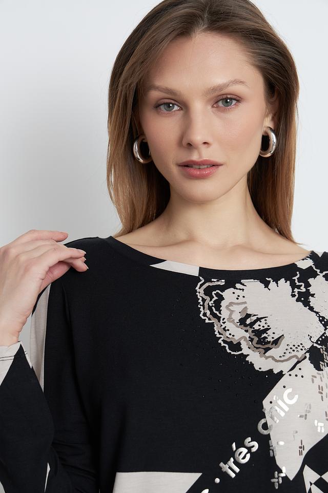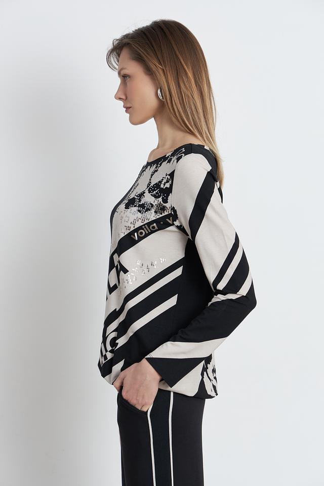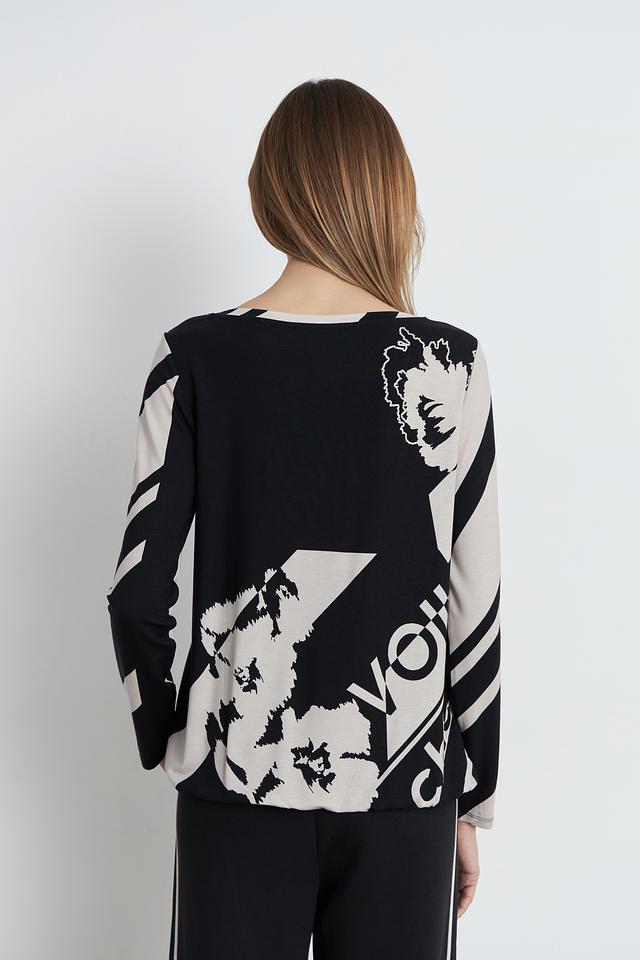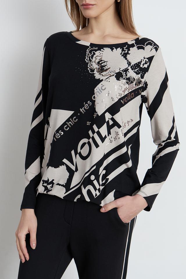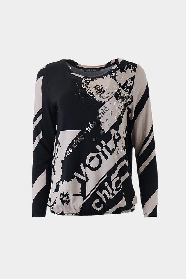 Эта стильная блуза от Betty Barclay выполнена в чёрно-бежевой гамме и украшена эффектным принтом с надписью "Voila" и графическими элементами.