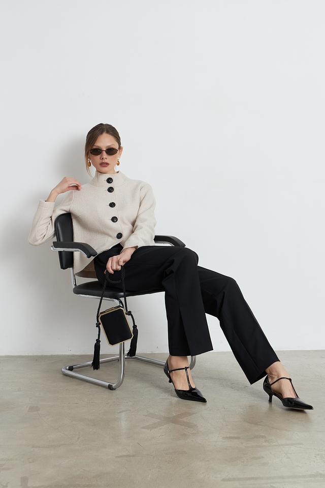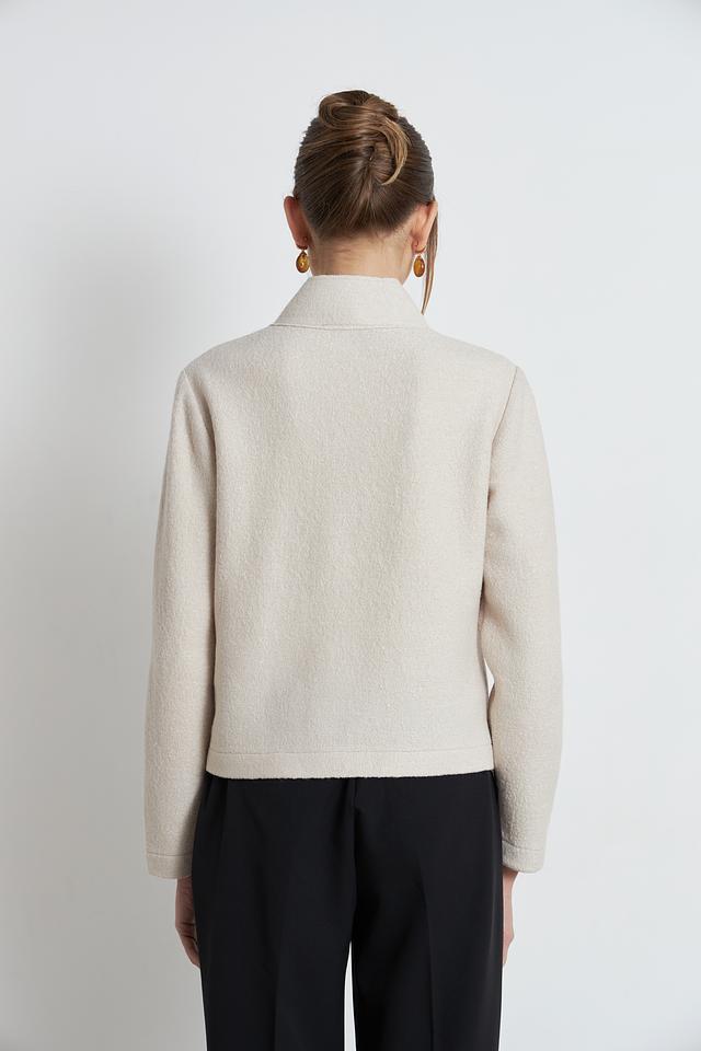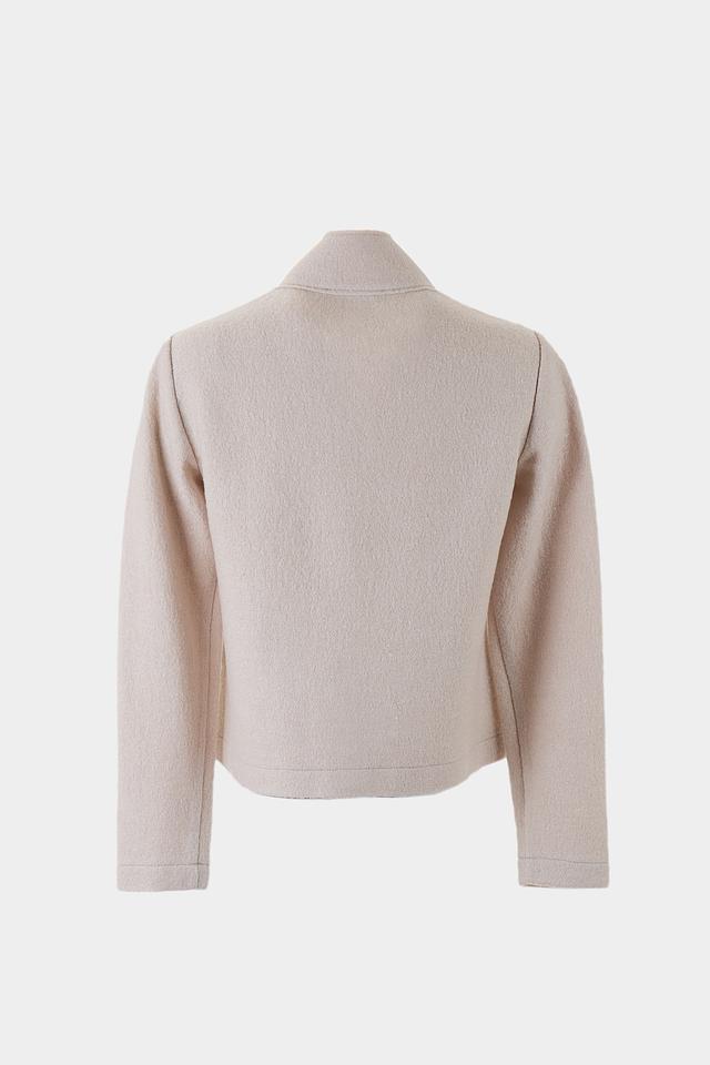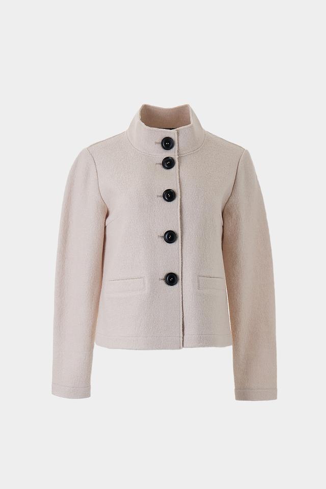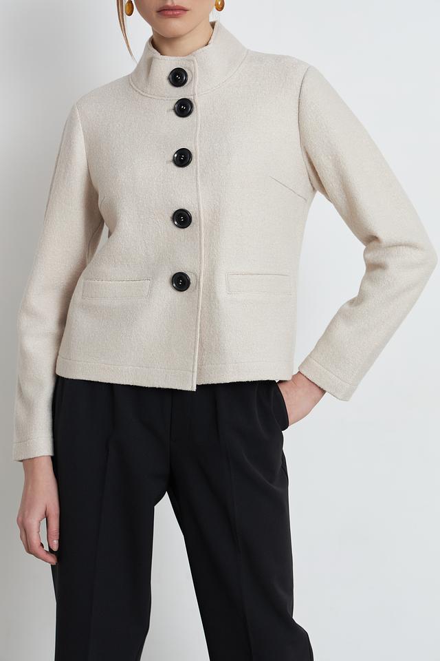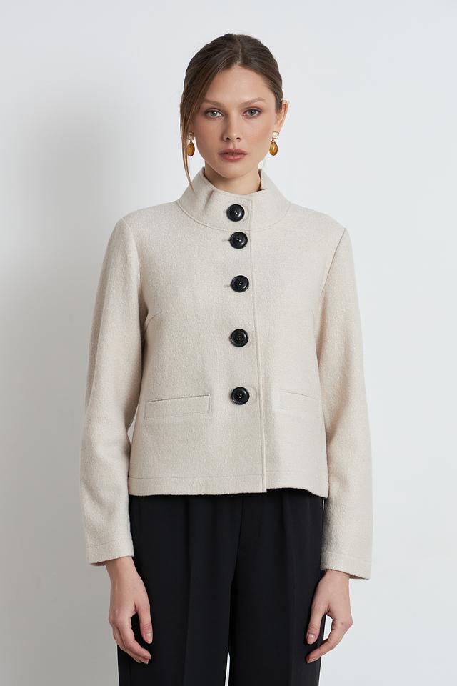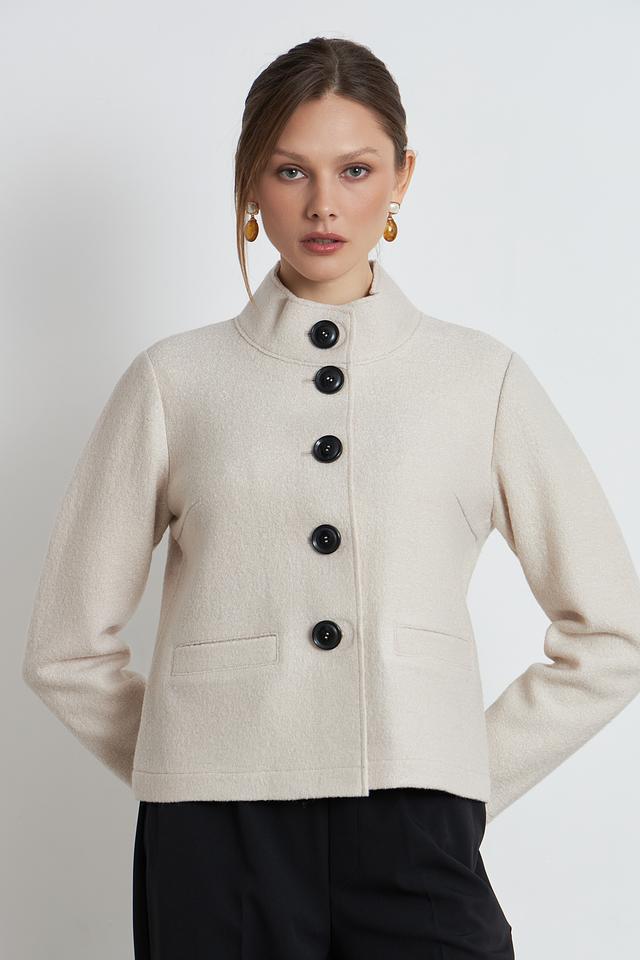 Жакет застегивается на ряд крупных чёрных пуговиц, что добавляет ему выразительности. Воротник-стойка придает модели элегантность и утонченность. Накладные карманы добавляют практичности.
