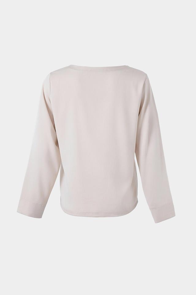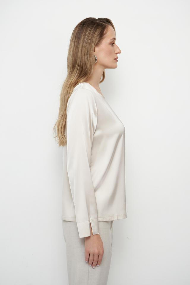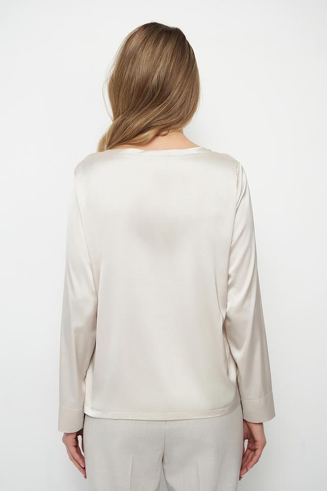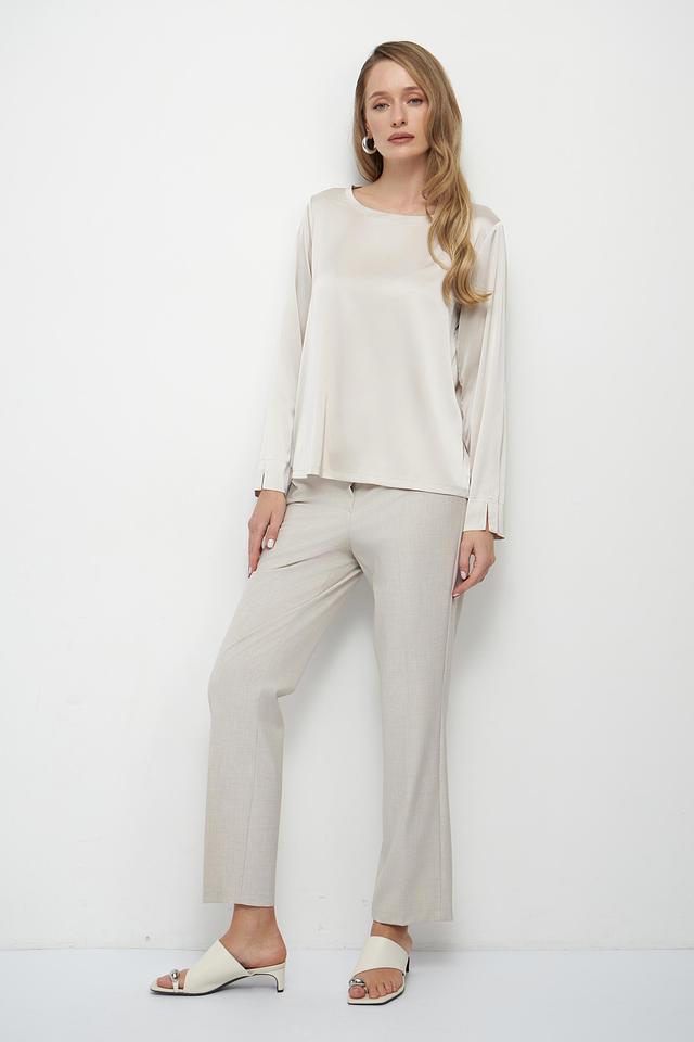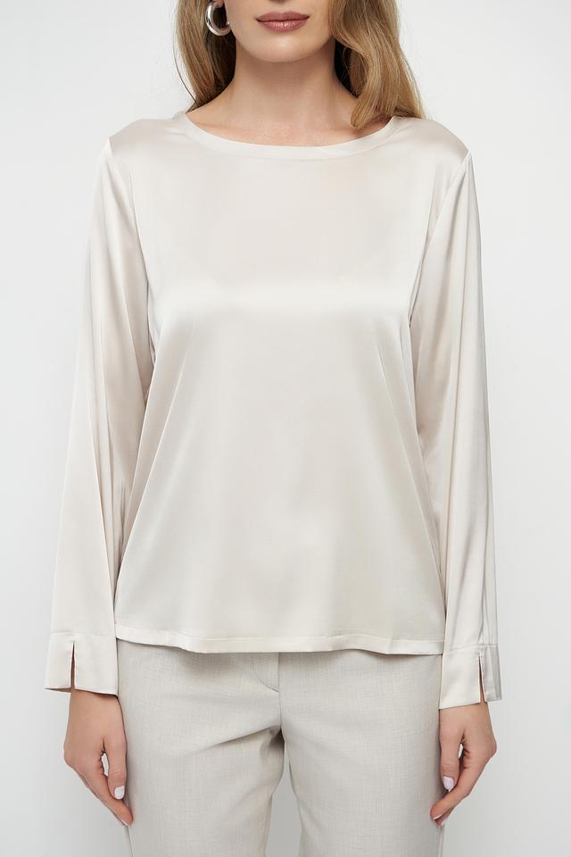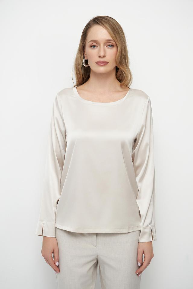 Блуза имеет прямой крой, длинные рукава и круглый вырез горловины. Ткань гладкая, приятная на ощупь, что обеспечивает комфорт при носке. Состав: 97% полиэстер, 3% эластан, что делает блузу устойчивой к сминанию и легкой в уходе.