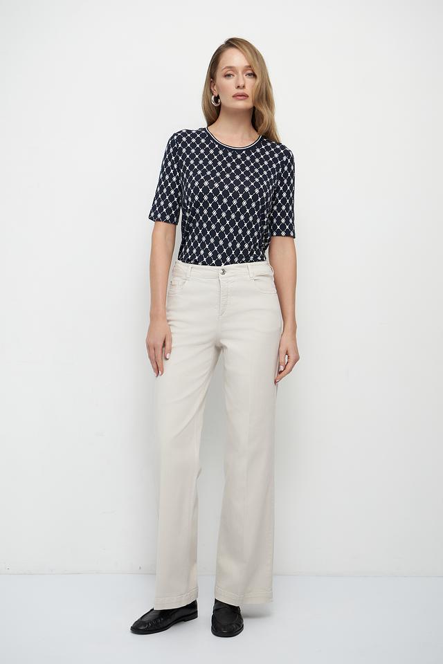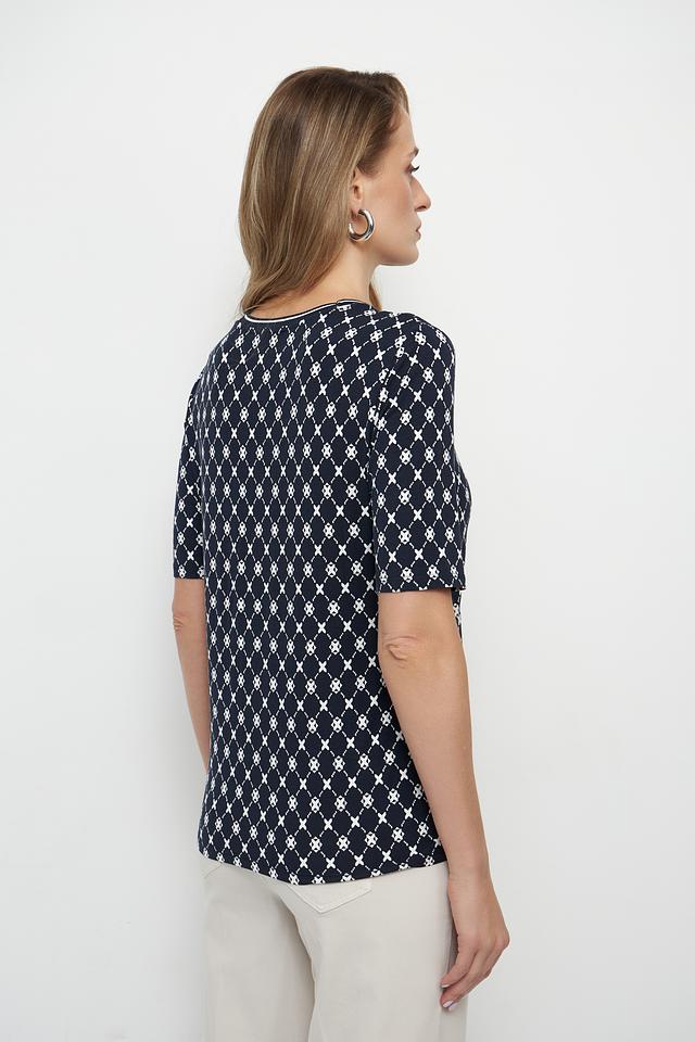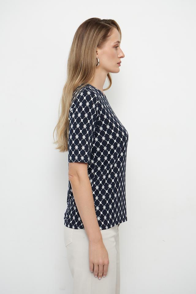 Футболка имеет классический крой с короткими рукавами и круглым вырезом горловины. Её отличает оригинальный принт в виде геометрической клетки, выполненной в белом цвете на темно-синем фоне. Этот узор добавляет образу изысканности и элегантности.