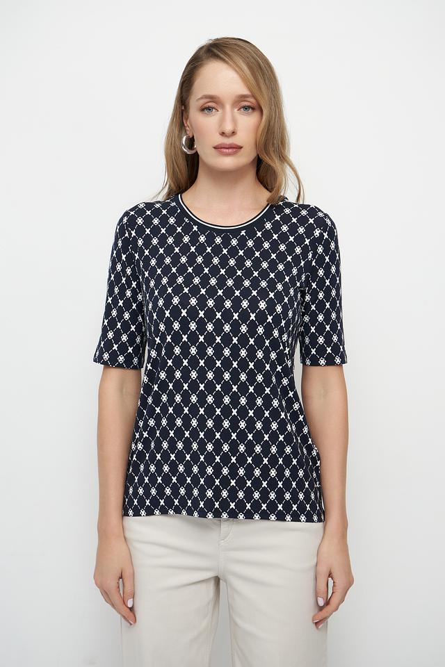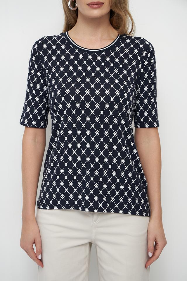 Женская футболка Betty Barclay темно-синего цвета с геометрическим принтом в белую клетку. Модель с короткими рукавами и круглым вырезом горловины выполнена из мягкой вискозы с добавлением эластана. Состав: вискоза 95%, эластан 5%