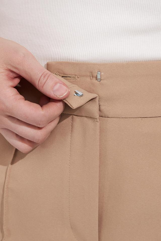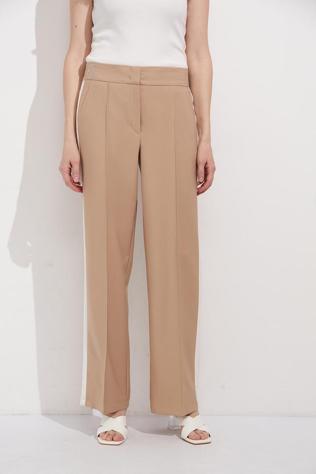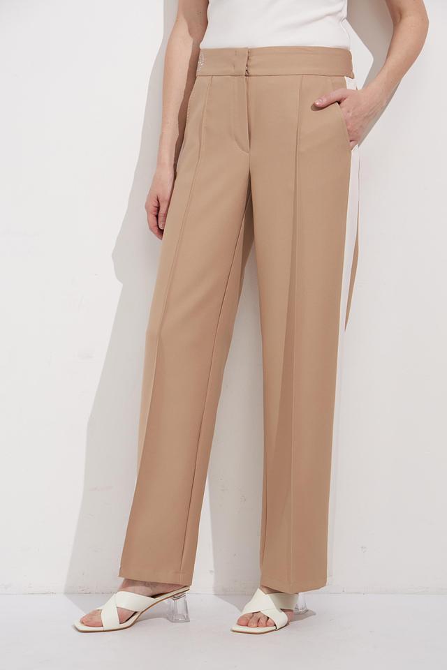Женские брюки Betty Barclay бежевого цвета с контрастной белой полосой по боковой части — стильное и комфортное решение для создания повседневных образов. Модель выполнена из качественного полиэстера с добавлением эластана, обеспечивающего удобную посадку. Состав: полиэстер 88%, эластан 12%