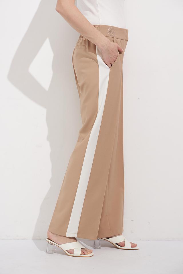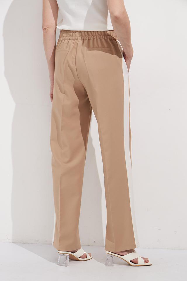 Брюки имеют прямой крой и классическую посадку на талии с эластичным поясом, что обеспечивает комфорт в носке. Отличительной особенностью является контрастная белая полоса, проходящая вдоль боковой части брюк, добавляющая динамичности и современности.