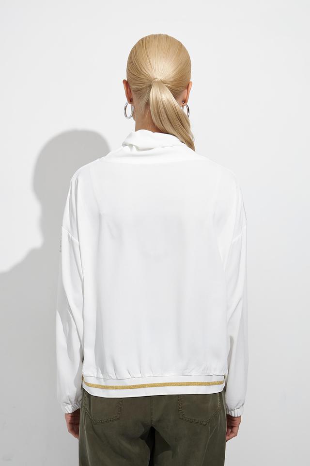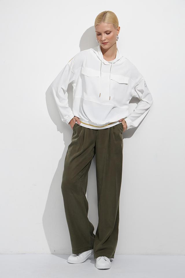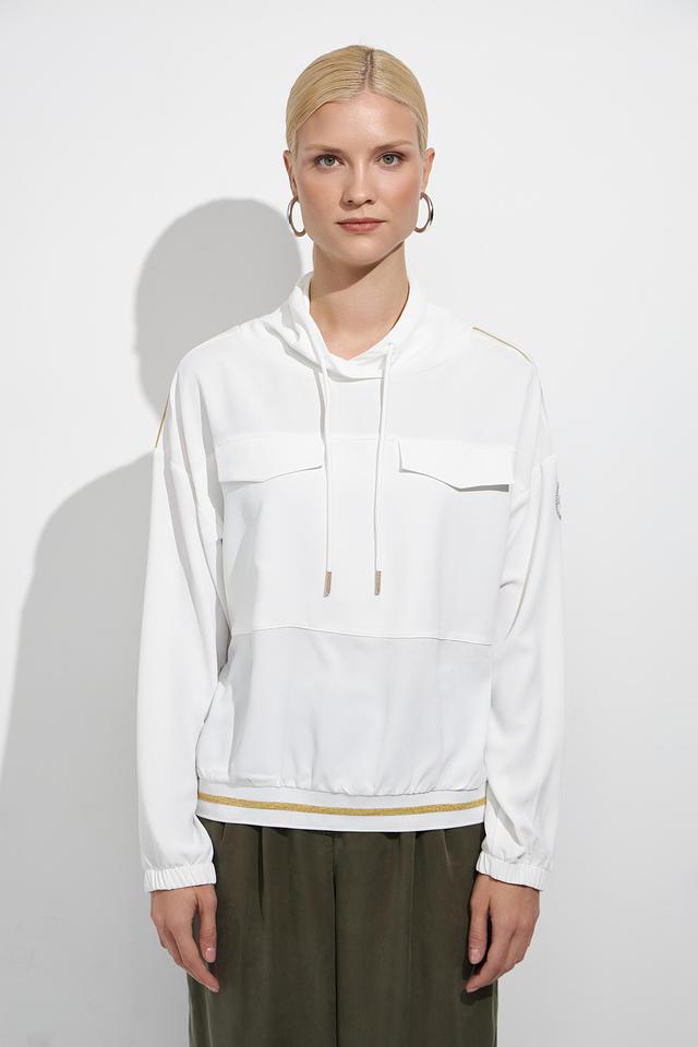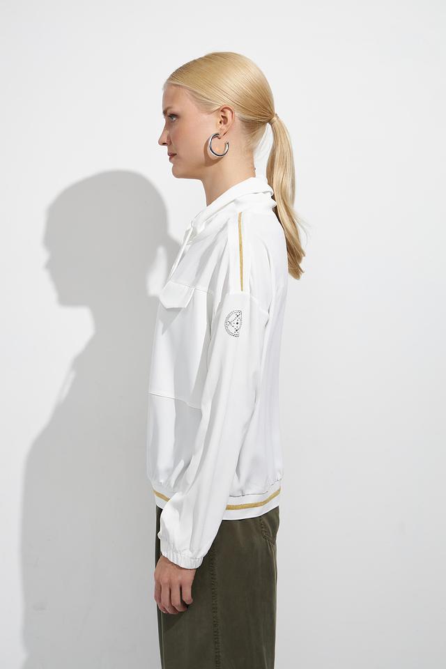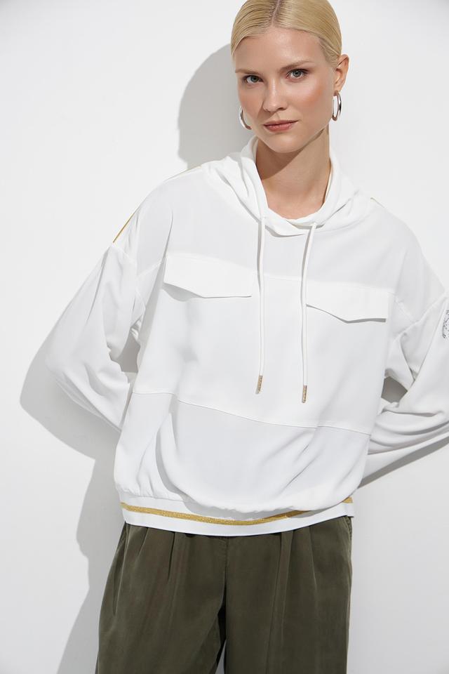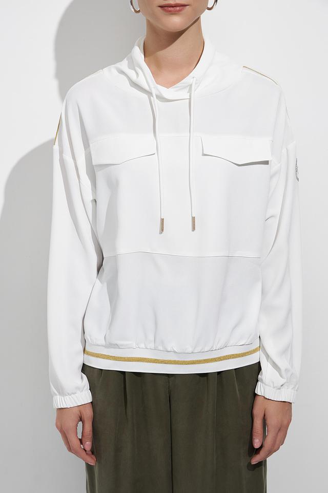 Белая блуза Betty Barclay свободного кроя с накладными карманами и капюшоном. Модель выполнена из полиэстера и дополнена золотистой отделкой по низу изделия и на рукавах. Состав: полиэстер 100%