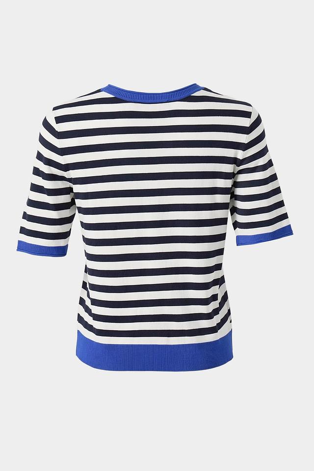 Женский пуловер Betty Barclay сине-белого цвета с короткими рукавами и отделкой по горловине и низу изделия. Модель выполнена в классической полосатой расцветке и станет отличным дополнением к вашему гардеробу. Состав: вискоза 80%, полиамид 20%