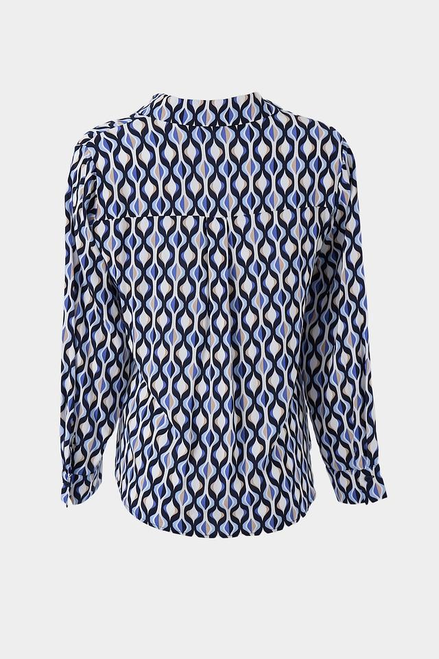 Основной цвет блузы – белый, но ее украшает яркий и динамичный геометрический принт, выполненный в синих, черных и бежевых тонах. V-образный вырез и длинные рукава придают блузе классический вид, а свободный крой обеспечивает свободу движений.