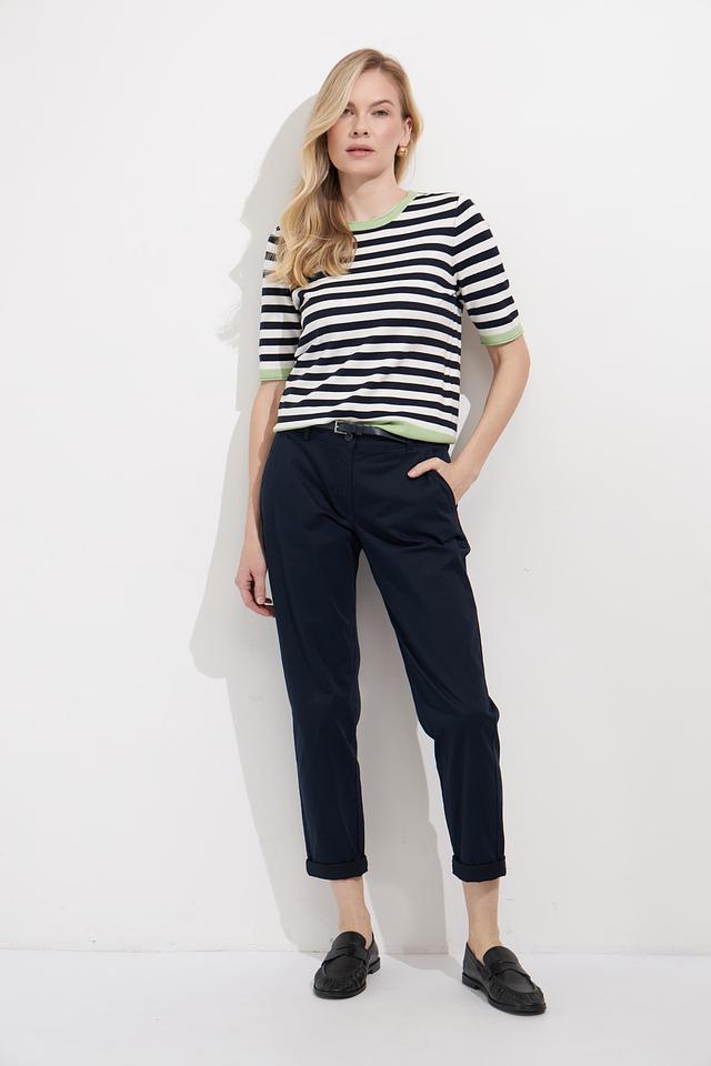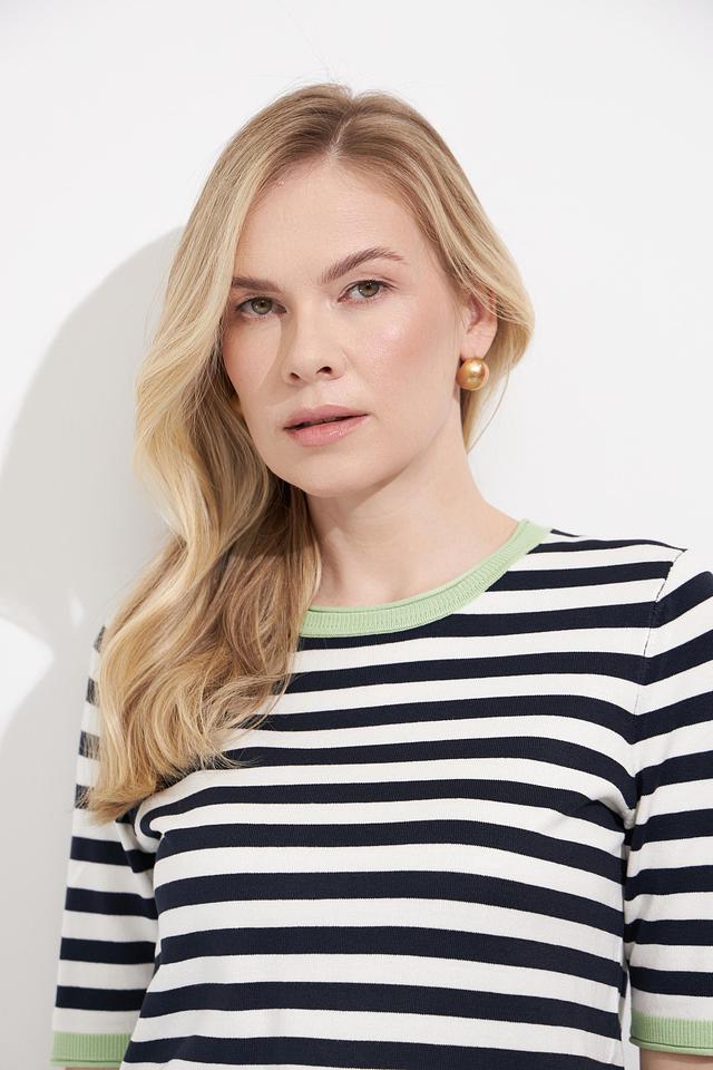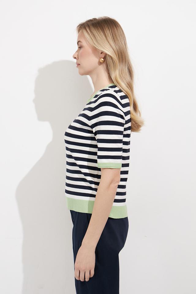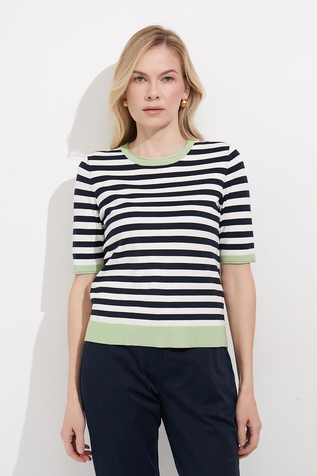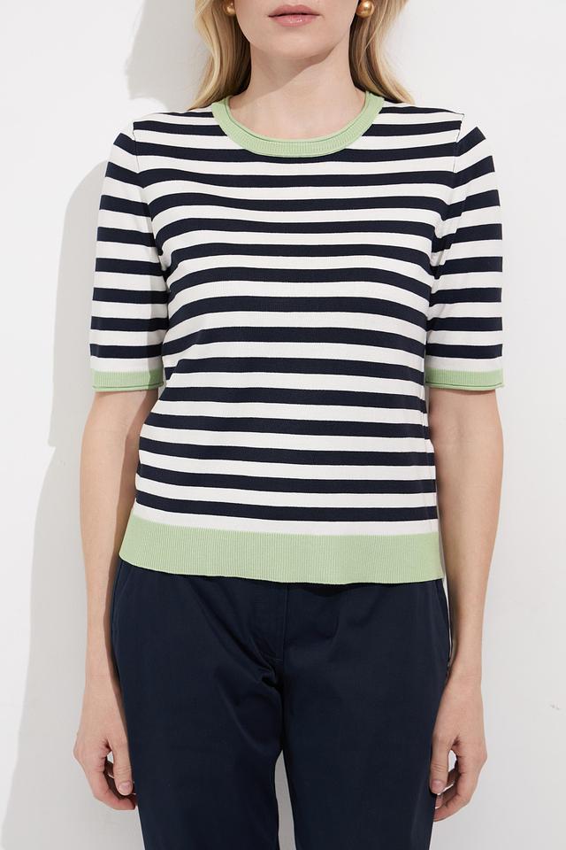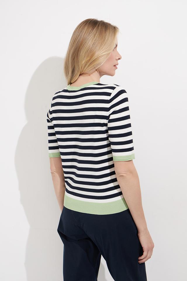 Женский пуловер Betty Barclay в классическую полоску сине-белого цвета с мятным воротником и манжетами. Модель с коротким рукавом выполнена из мягкого и приятного к телу трикотажа. Состав: вискоза 80%, полиамид 20%