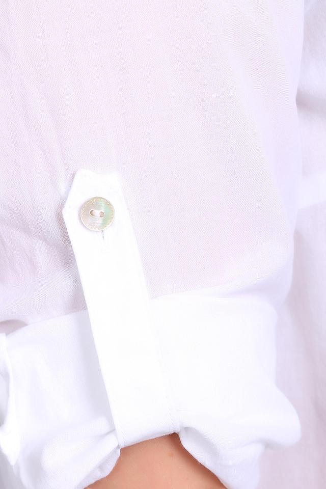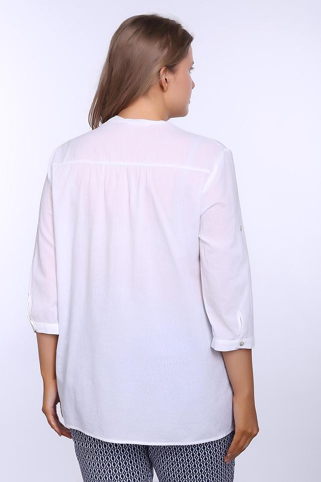 Блуза имеет прямой крой и длину до бедер, что делает ее удобной и практичной. Рукав 3/4 с манжетами на пуговицах добавляет образу элегантности.