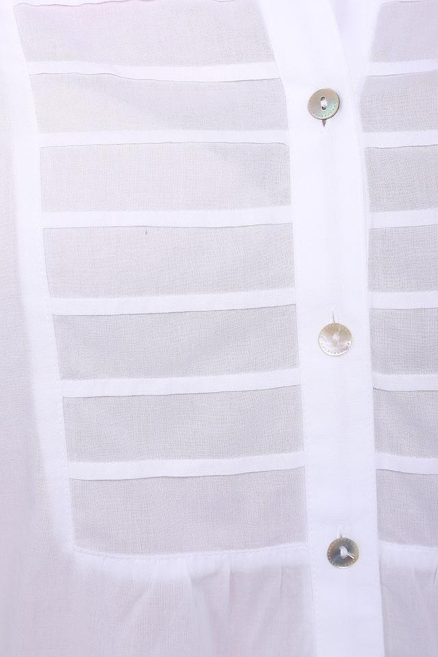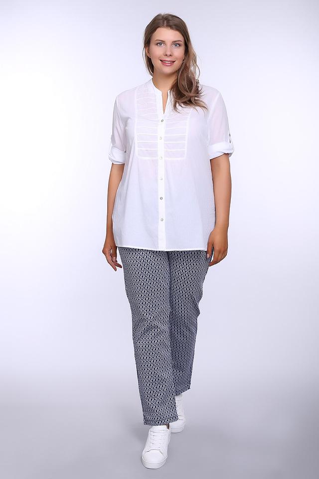 Особенностью данной модели являются декоративные вертикальные планки на лифе, которые визуально вытягивают силуэт. Застежка на пуговицы по всей длине изделия. Блуза выполнена из 100% хлопка, что обеспечивает комфорт в носке и позволяет коже дышать.