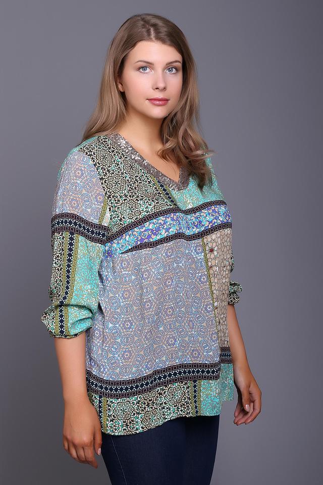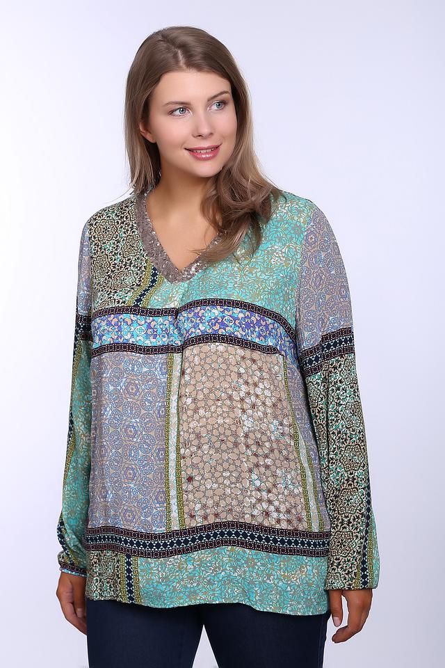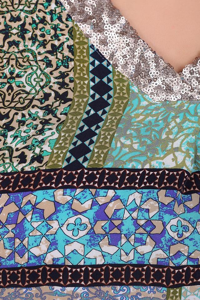 Дизайн блузки выполнен в стилистике пэчворк, объединяя блоки с разнообразными геометрическими и этническими узорами в оттенках голубого, бежевого, зеленого и синего. Это создаёт уникальный и выразительный образ. Горловина украшена эффектными серебристыми пайетками, добавляющими изделию изысканный блеск.
