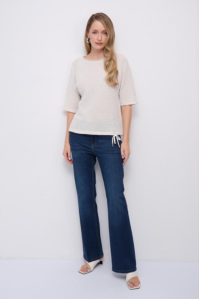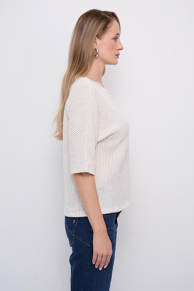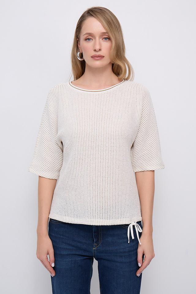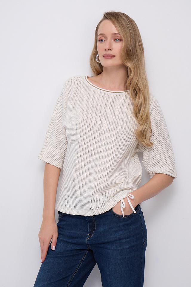 Модель имеет короткие рукава 3/4, что делает ее идеальным выбором для теплой погоды. Вырез горловины округлый, классический. Пуловер имеет свободный крой, который обеспечивает комфорт и свободу движений.
