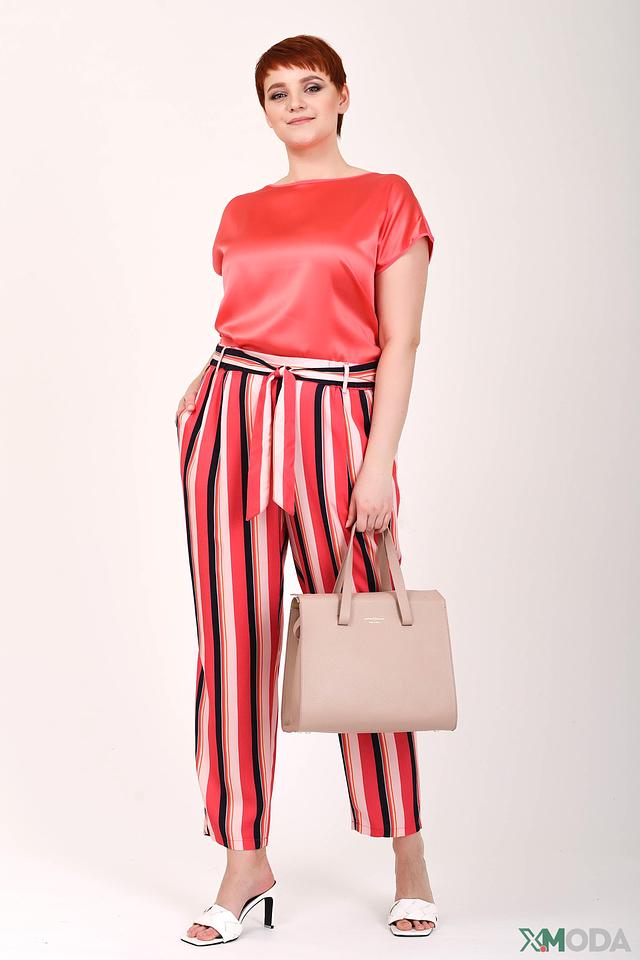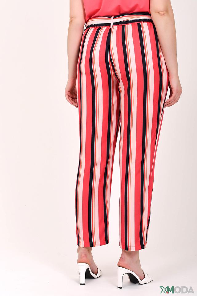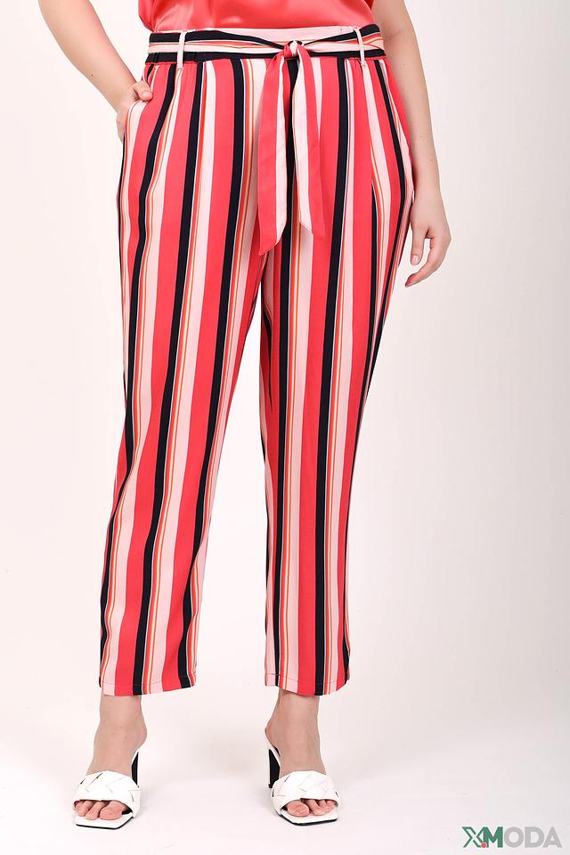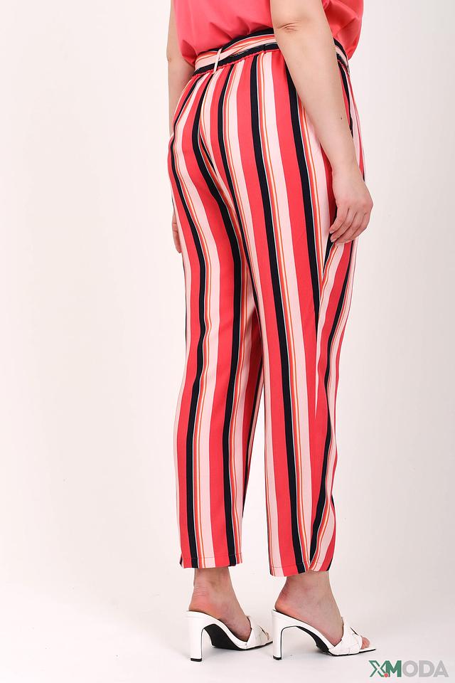 Брюки отличаются оригинальным дизайном – широкой полоской, сочетающей в себе красный, белый и черный цвета. Пояс с завязками позволяет подчеркнуть талию и создать более женственный силуэт.