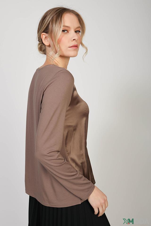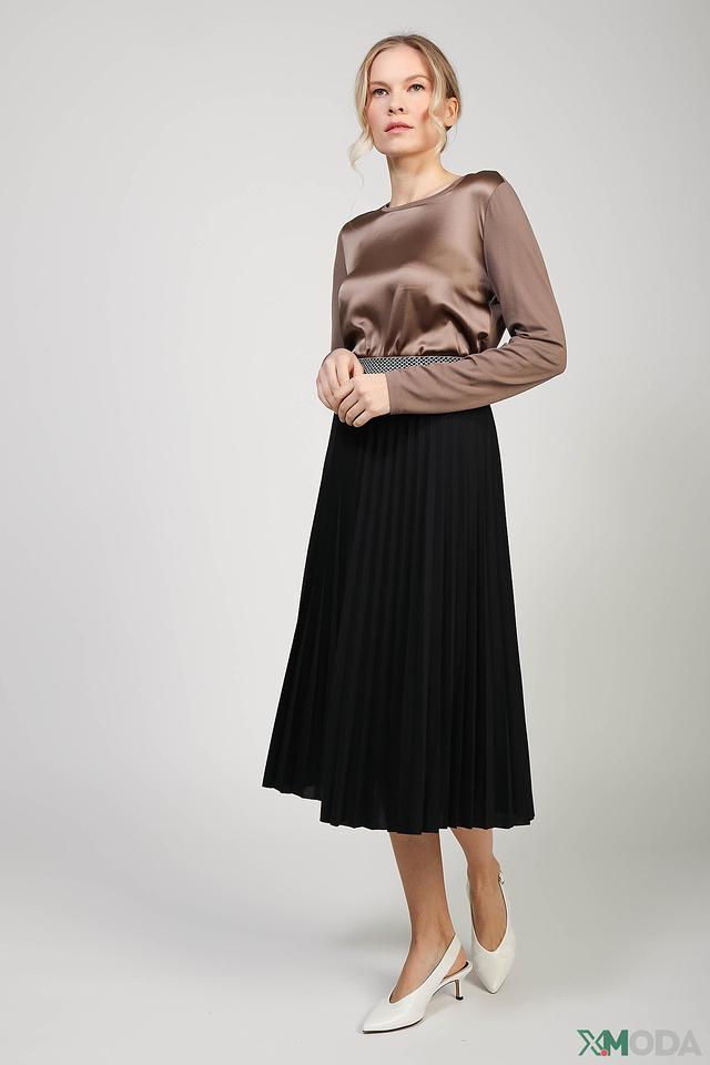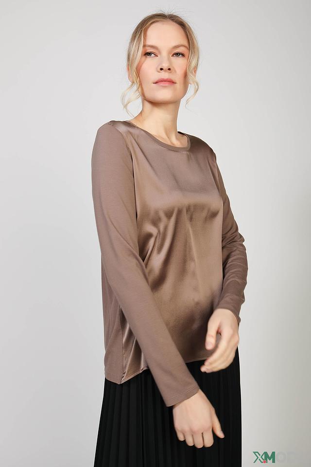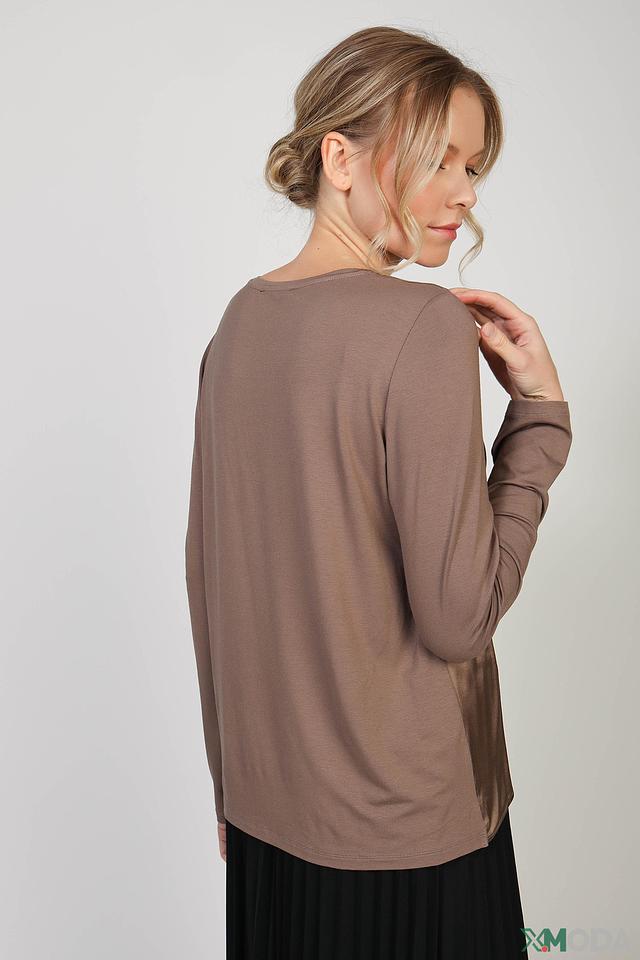 Блуза имеет длинные рукава и округлый вырез горловины. Её свободный крой не сковывает движений, а элегантный коричневый цвет делает её универсальной для создания различных образов.