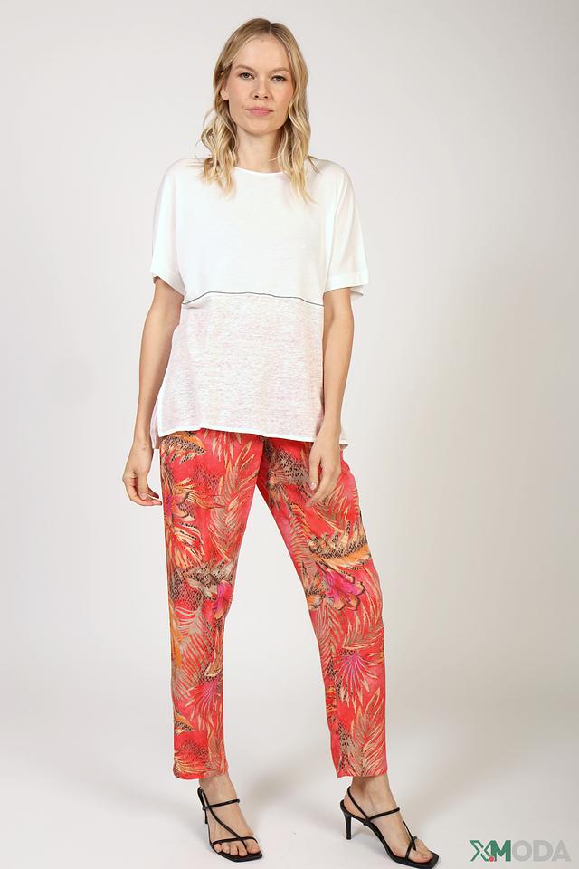 Брюки имеют прямой крой, стандартную посадку по талии и эластичный пояс с кулиской, обеспечивающий удобную посадку по фигуре. Они оснащены боковыми карманами. Яркий цветочный принт добавляет образу женственности и легкости.