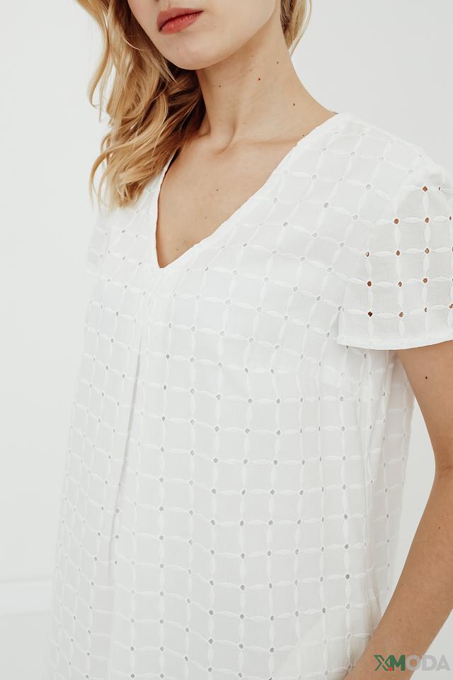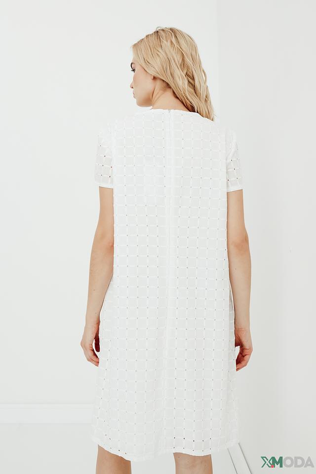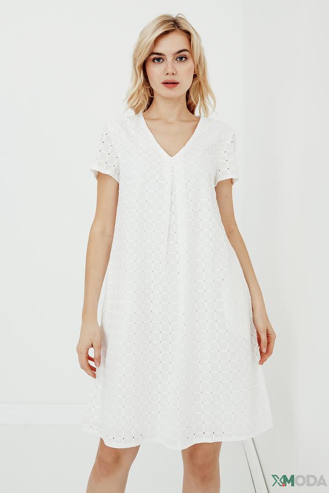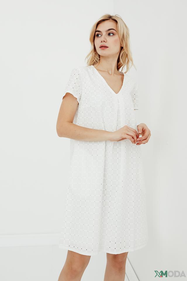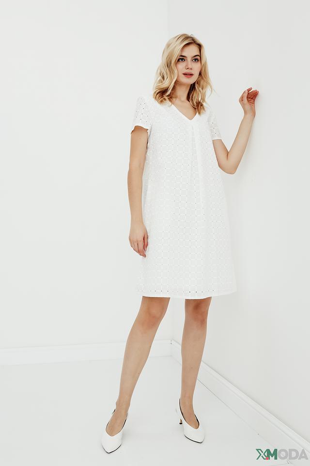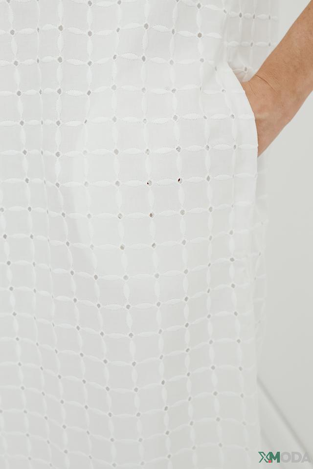 Платье имеет прямой силуэт, короткие рукава и V-образный вырез. Особый шарм ему придает ажурная вышивка, покрывающая всю поверхность изделия. Благодаря легкому и дышащему материалу, платье идеально подходит для жаркой погоды.