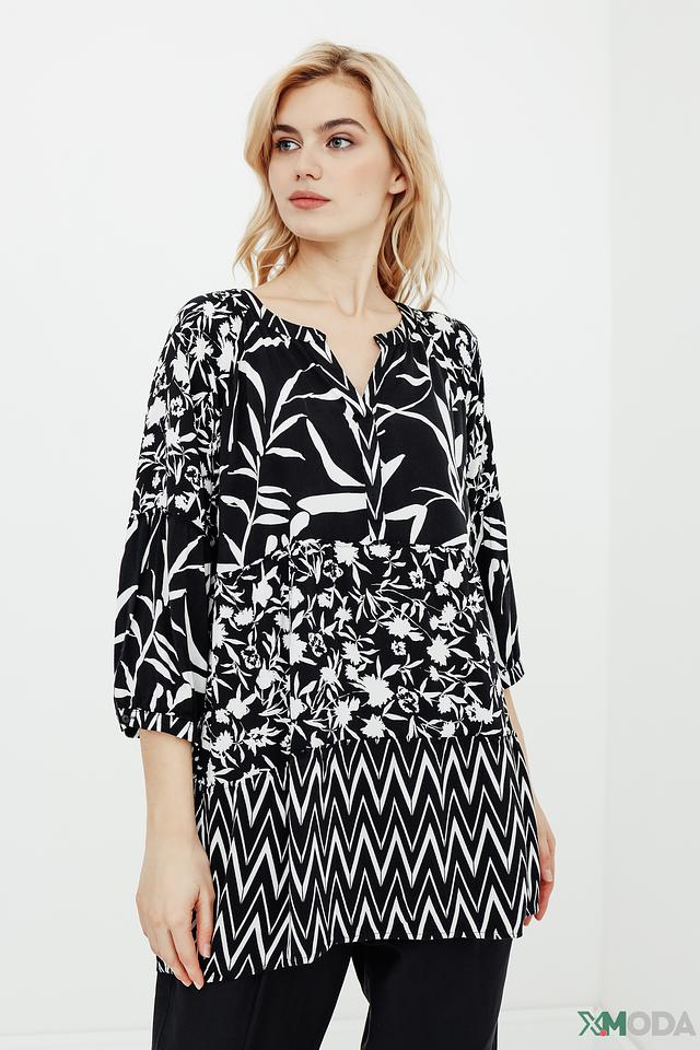 Блуза Betty Barclay чёрно-белого цвета с оригинальным цветочным и геометрическим принтом. Модель выполнена из мягкой вискозы, имеет V-образный вырез и рукава 3/4. Состав: вискоза 100%