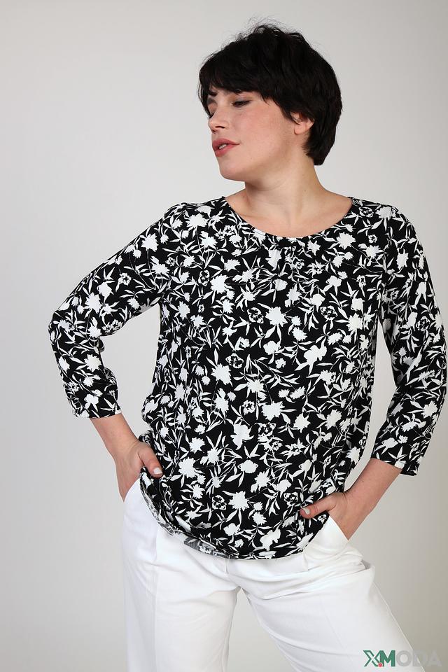 Основной цвет блузы – чёрный, а ярким акцентом является белоснежный цветочный принт, который добавляет свежести и лёгкости. Такой рисунок делает блузу универсальной и подходящей для создания различных образов – от повседневных до более нарядных.