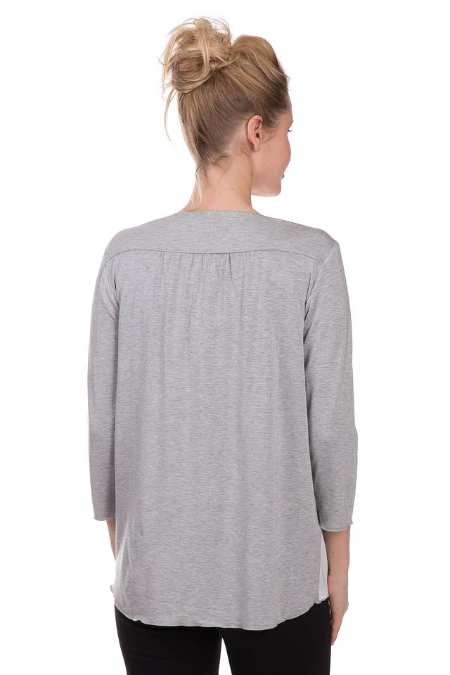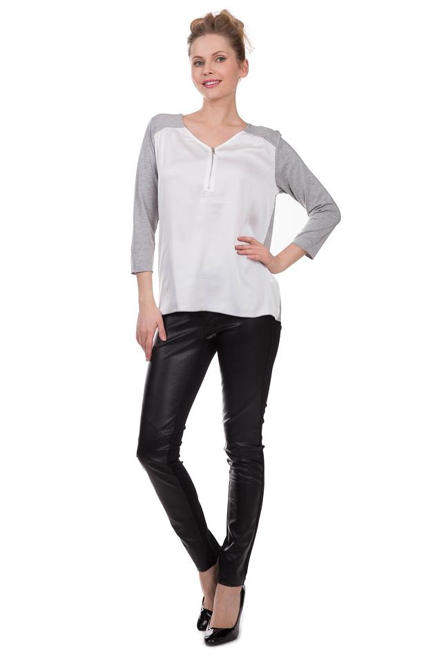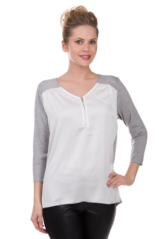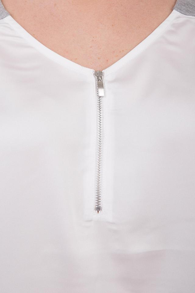 Модель имеет V-образный вырез, который украшен короткой молнией, придающей блузе особый шарм. Рукава 3/4 выполнены в сером цвете, что добавляет контраста и визуально делает силуэт более интересным.