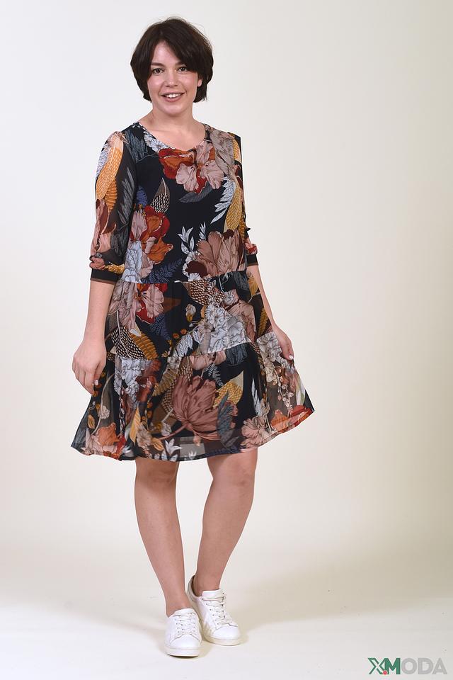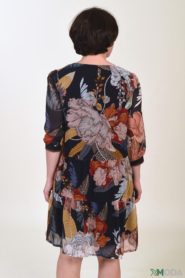 Платье имеет прямой силуэт, длину до колена и рукава 3/4. Вырез горловины округлый, украшен небольшим вырезом с завязками. Основной цвет платья – черный, а его особенностью является яркий и красочный цветочный принт, включающий в себя различные оттенки коричневого, бежевого, оранжевого и голубого.