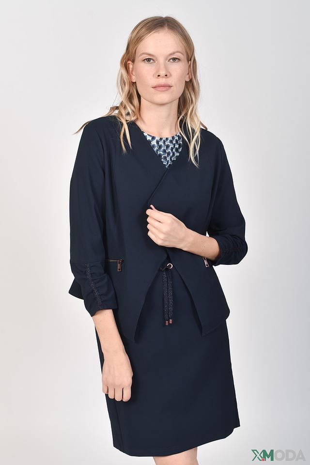 Жакет застегивается на потайные застежки, что создает аккуратный и лаконичный вид. Состав ткани: 86% полиэстер, 14% эластан, что обеспечивает комфорт в носке и легкий уход.