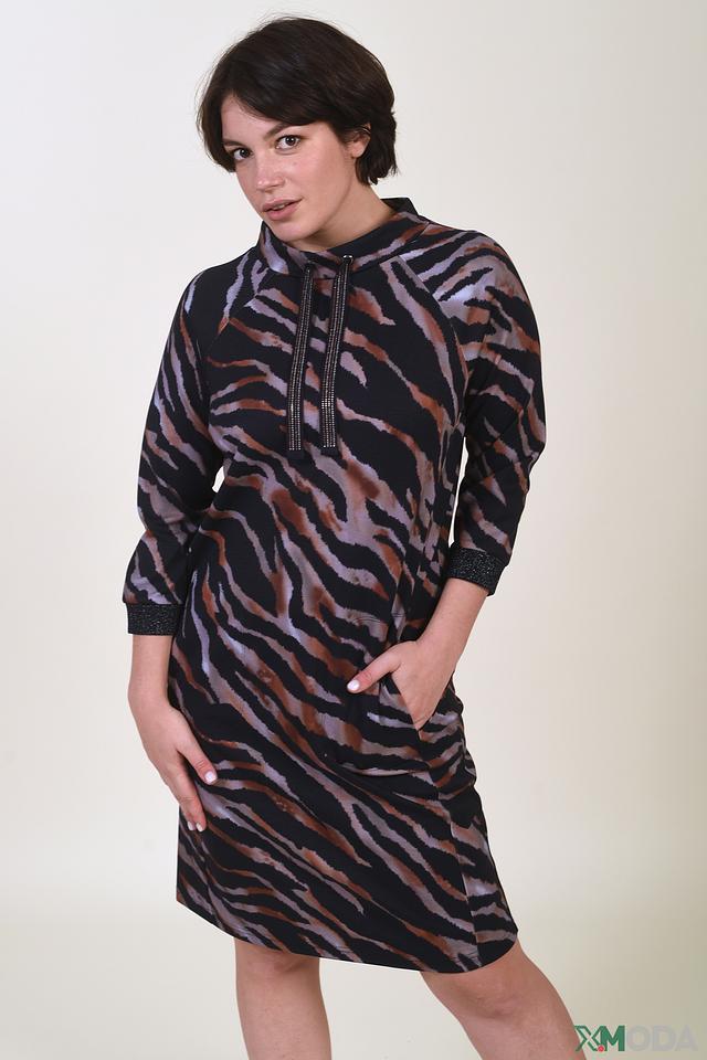 Это стильное платье от Betty Barclay выполнено в черном цвете и украшено ярким принтом в виде полос "зебра", выполненным в коричневых и серо-коричневых оттенках. Платье имеет приталенный силуэт, который подчеркивает фигуру, и длину до колена.
