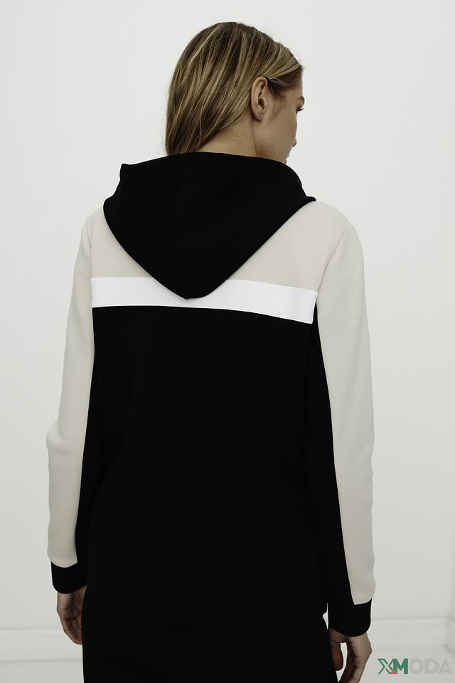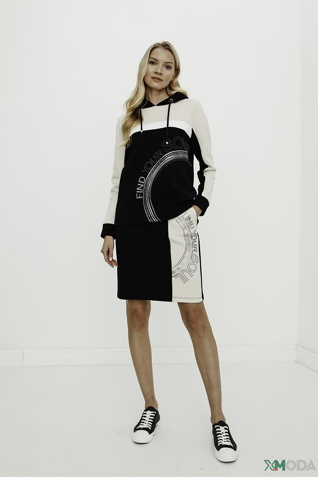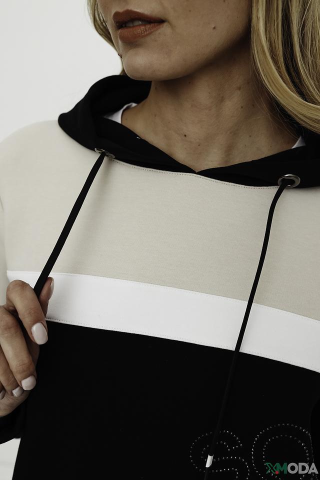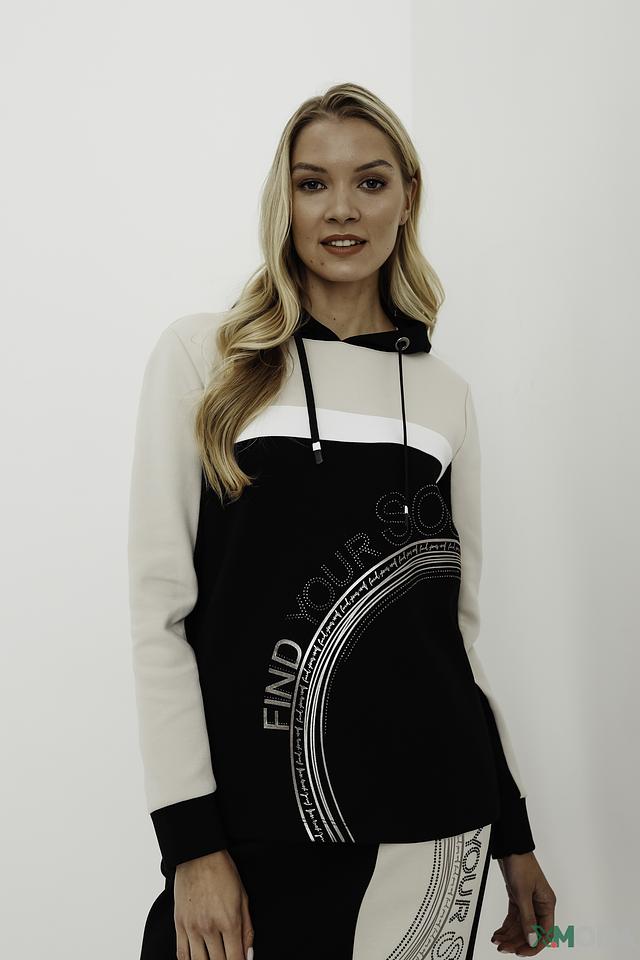 Женский пуловер Betty Barclay чёрно-бежевого цвета с капюшоном и оригинальным принтом. Модель выполнена из мягкого хлопка с добавлением полиэстера и эластана, обеспечивающих комфорт и удобство в носке. Состав: хлопок 54%, полиэстер 40%, эластан 6%