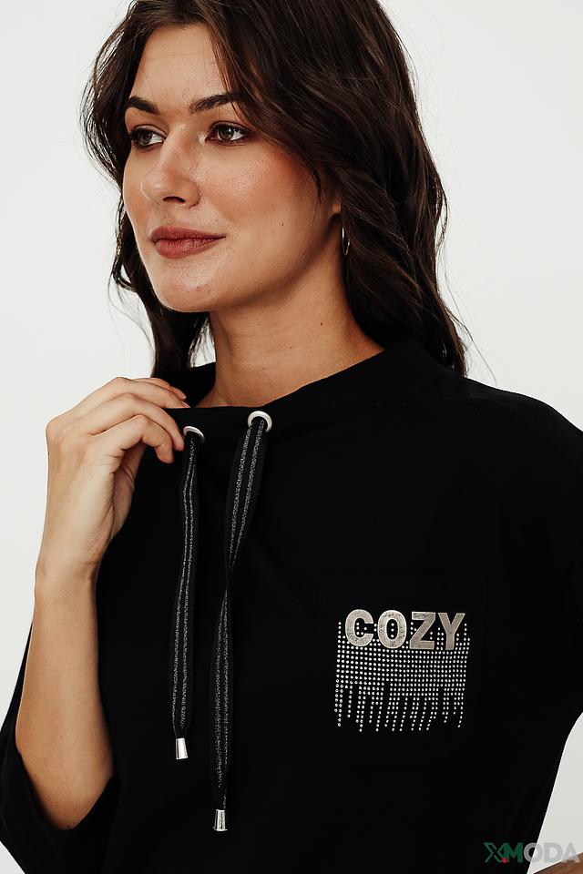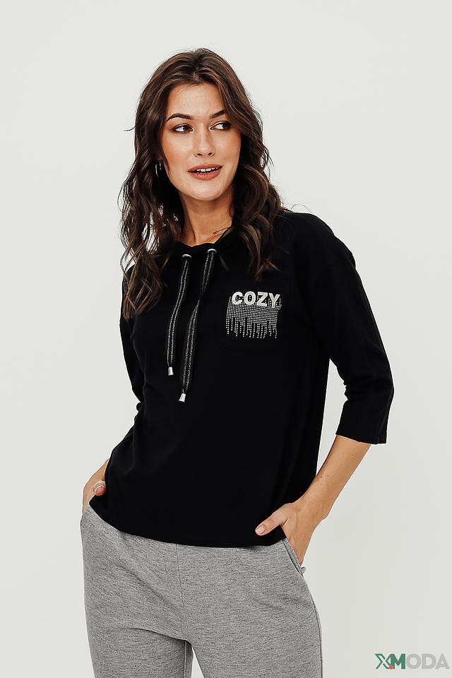 Чёрный пуловер от Betty Barclay с рукавом 3/4, украшенным стразами и капюшоном с кулиской. Модель выполнена из мягкого хлопка с добавлением эластана для комфортной посадки. Состав: хлопок 95%, эластан 5%