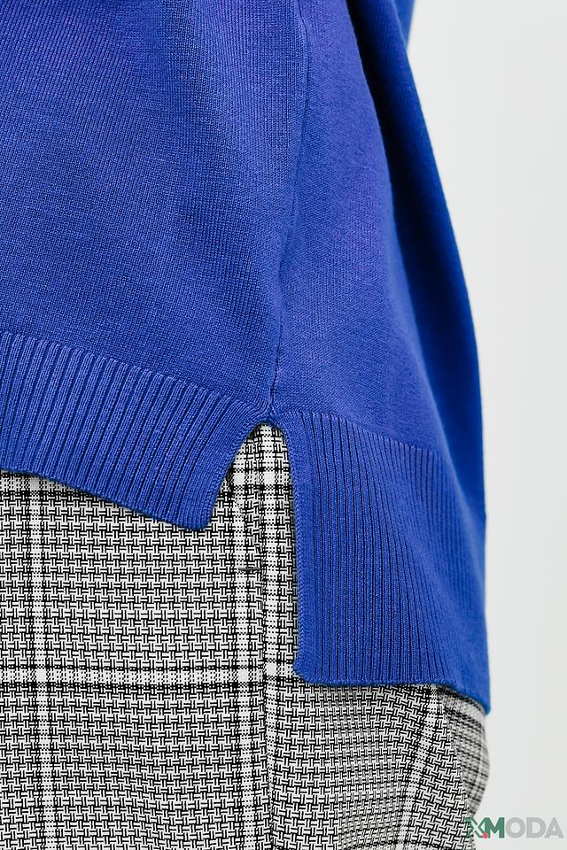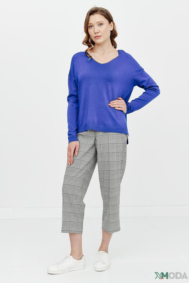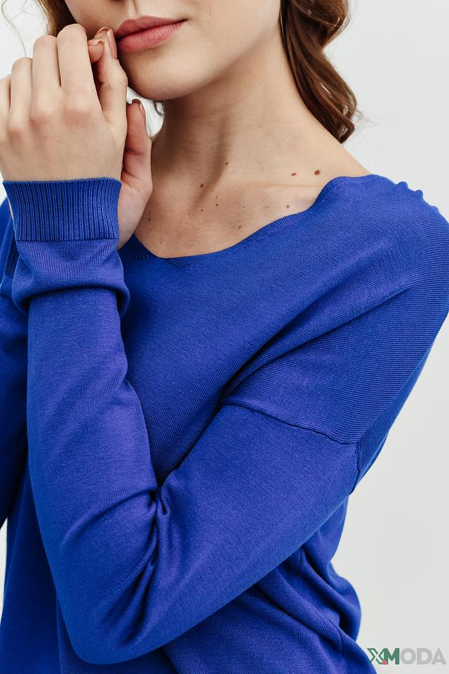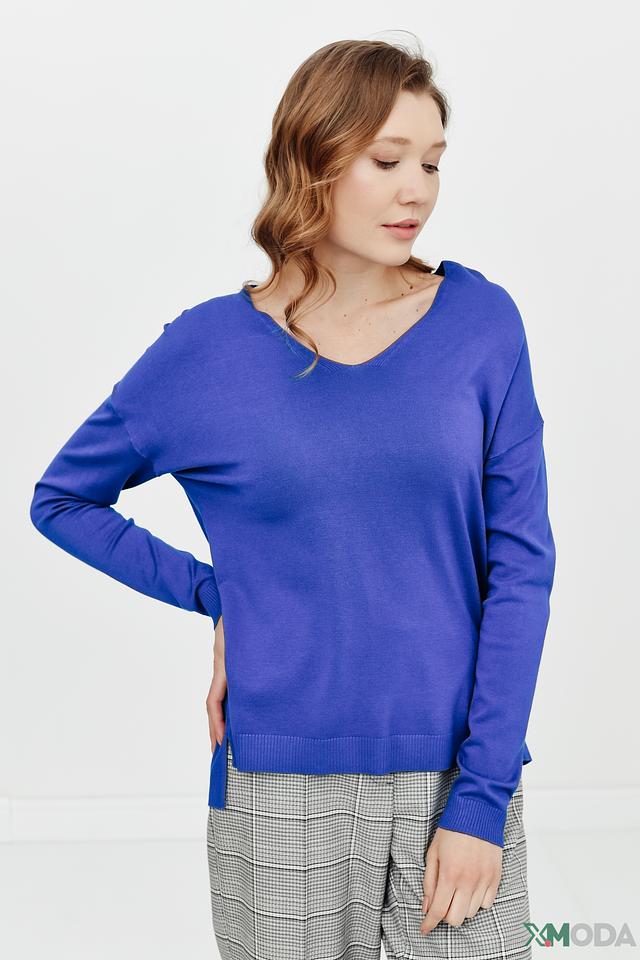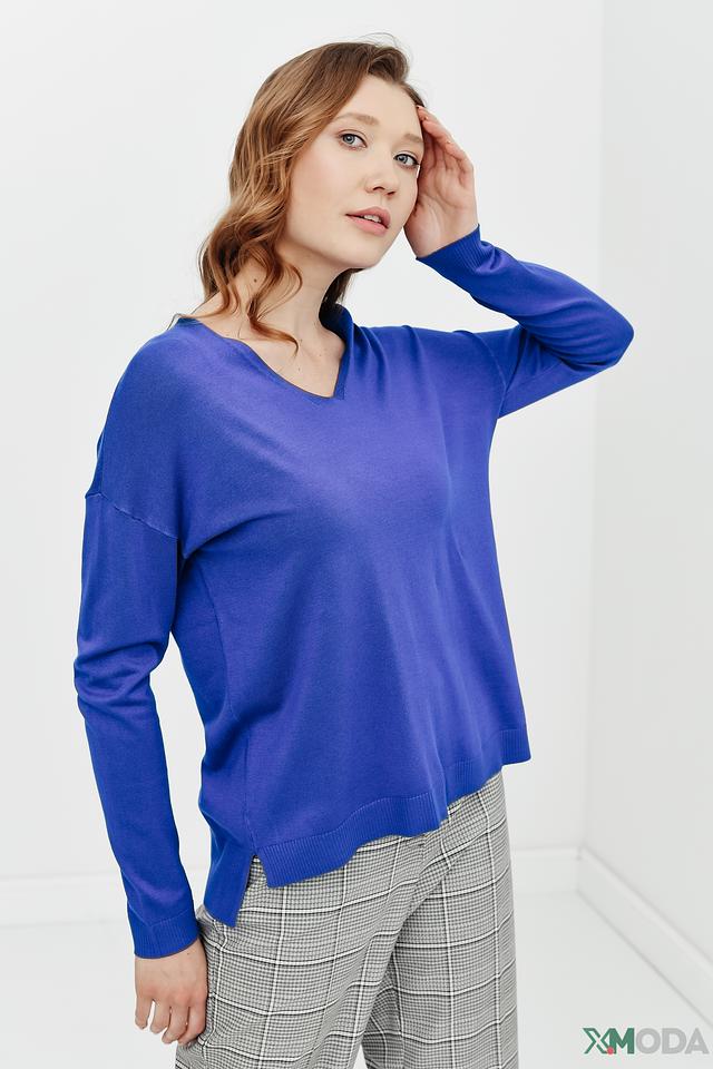 Пуловер имеет классический V-образный вырез, который визуально удлиняет шею и делает силуэт более изящным. Длинные рукава обеспечивают комфорт в прохладную погоду. Модель отличается свободным кроем, не сковывающим движений.