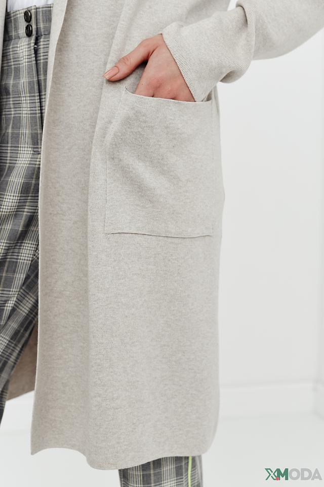 Кардиган имеет прямой крой, который подходит для любой фигуры. Широкий отложной воротник добавляет элегантности, а удобные боковые карманы делают его практичным. Бежевый цвет кардигана универсален и легко сочетается с различными элементами одежды.