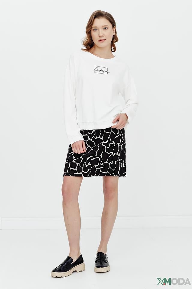 Юбка имеет классическую длину и прямой крой. Ее украшает стильный принт, который придает образу оригинальность и выразительность. Черный цвет юбки легко сочетается с различными элементами одежды, позволяя создавать разнообразные комплекты.