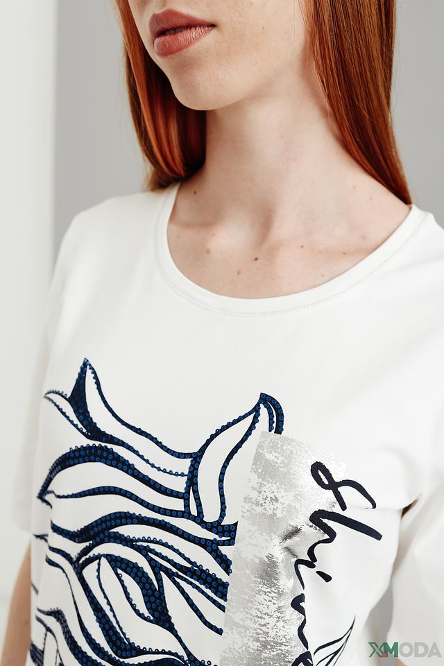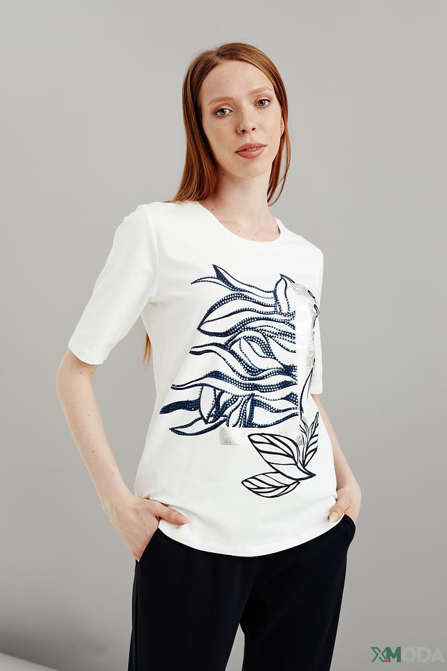 Основной цвет футболки – белый, что делает ее универсальной и легко сочетаемой с другими элементами одежды. Главная особенность модели – яркий и оригинальный принт на лицевой стороне, выполненный в сине-серебристой гамме. Принт изображает стилизованные листья и надпись "Shine", добавляя образу изысканность и индивидуальность.