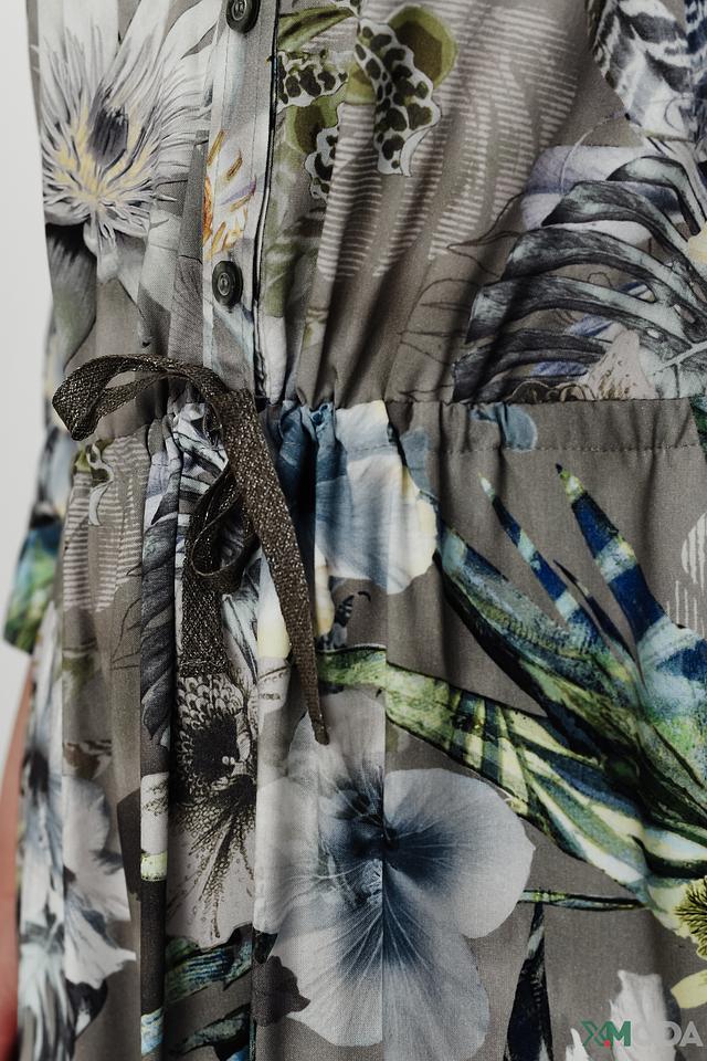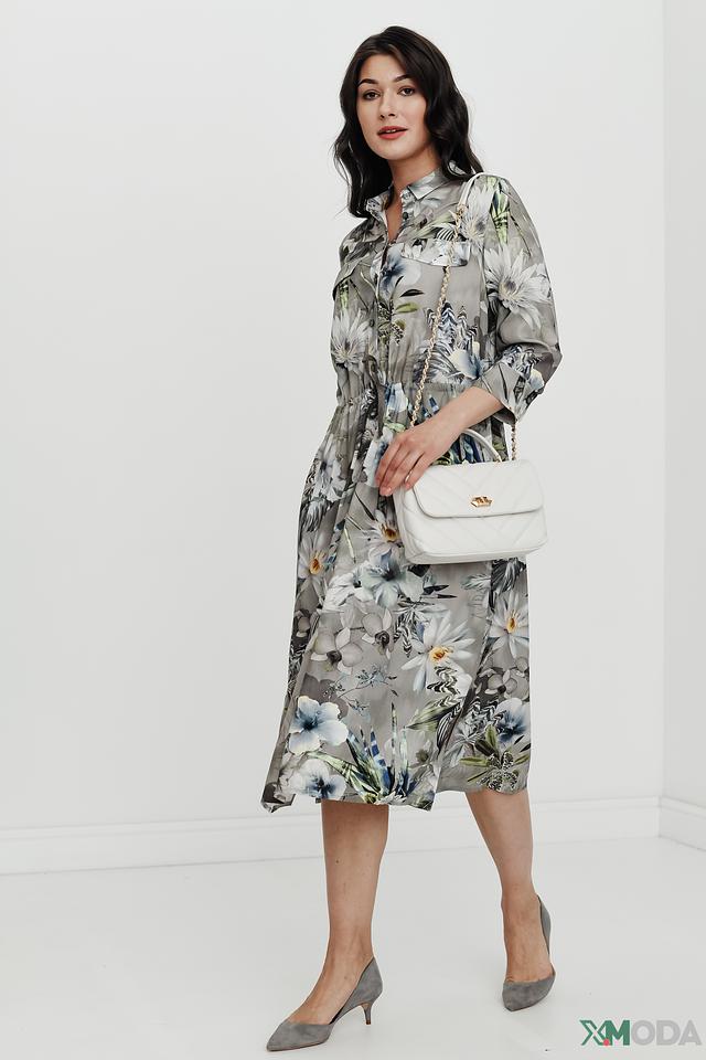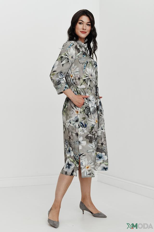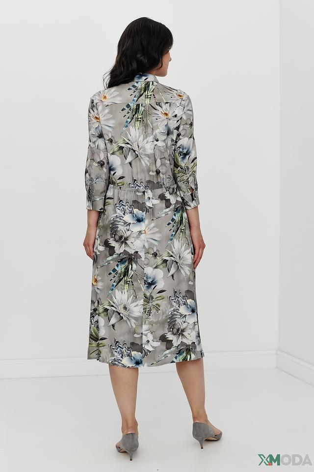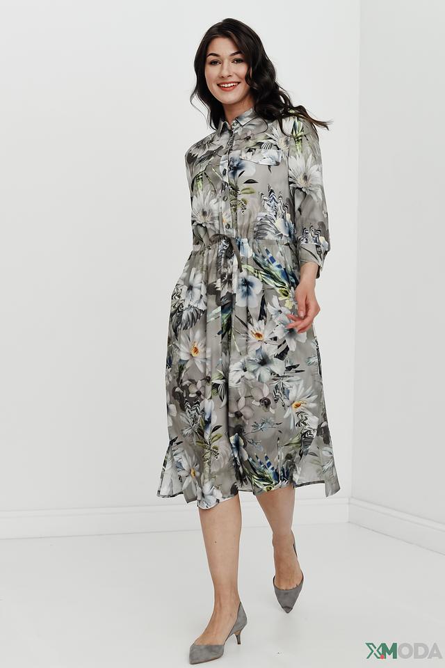 Основной цвет платья – серый, но его украшает яркий и красочный цветочный принт, включающий в себя оттенки белого, голубого, зеленого и синего. Платье имеет рубашечный крой с воротником и застежкой на пуговицы. Талию подчеркивает пояс, который можно завязать на бант или оставить распущенным.