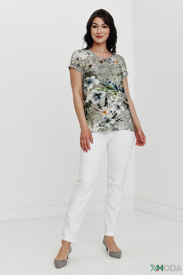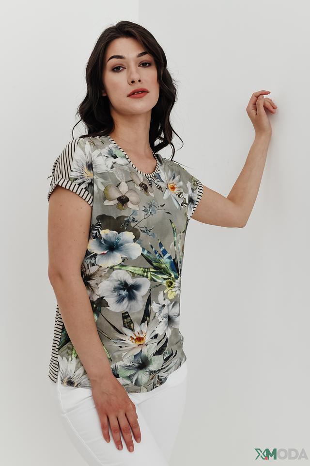 Женская футболка Betty Barclay серого цвета с ярким цветочным принтом и оригинальным дизайном рукавов. Изготовлена из мягкой вискозы с добавлением эластана для комфорта и удобства. Состав: вискоза 95%, эластан 5%
