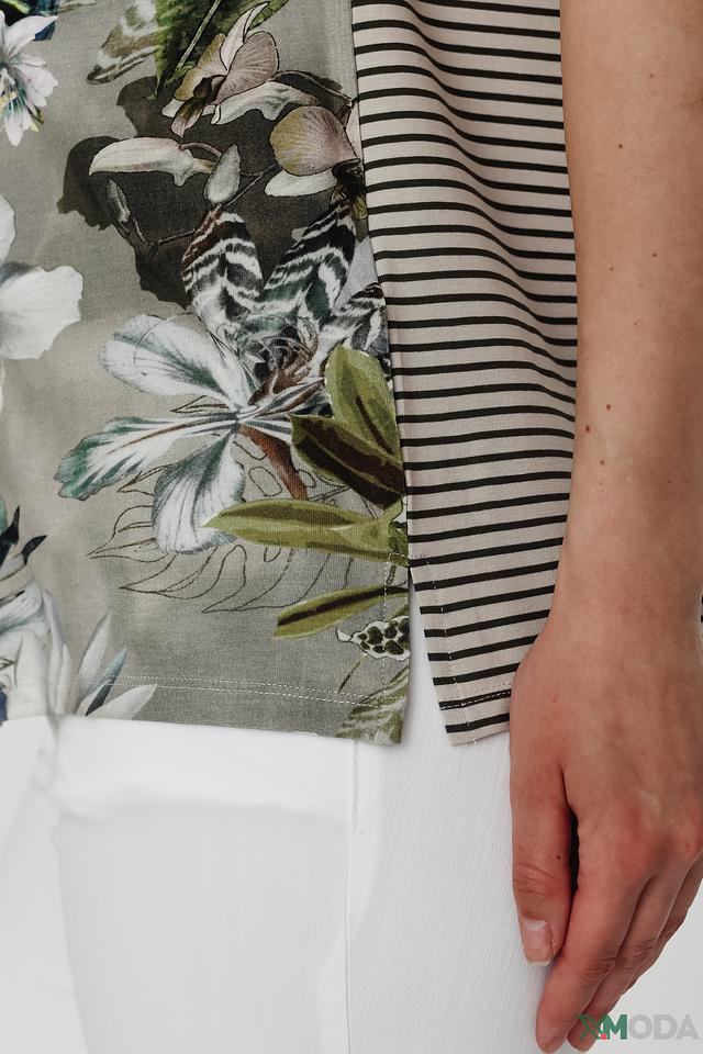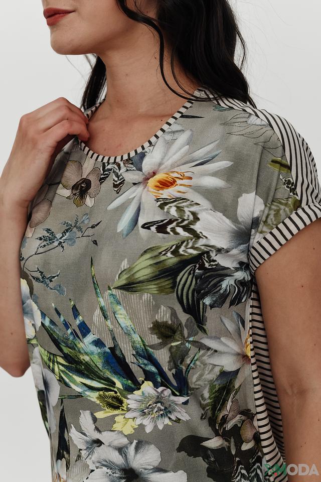 Основной цвет футболки – серый, но её украшает яркий и красочный цветочный принт, который добавляет образу женственности и легкости. Особое внимание привлекает оригинальный дизайн рукавов: сочетание однотонной ткани и полоски в черно-белую полоску.