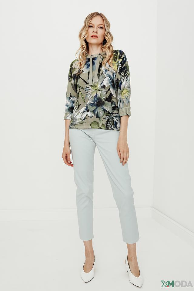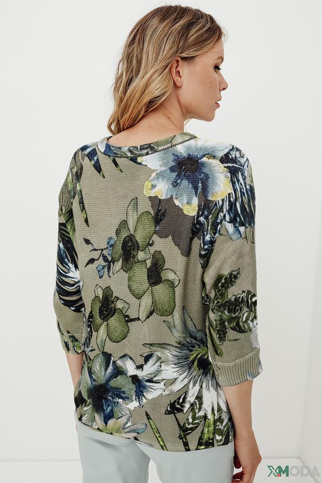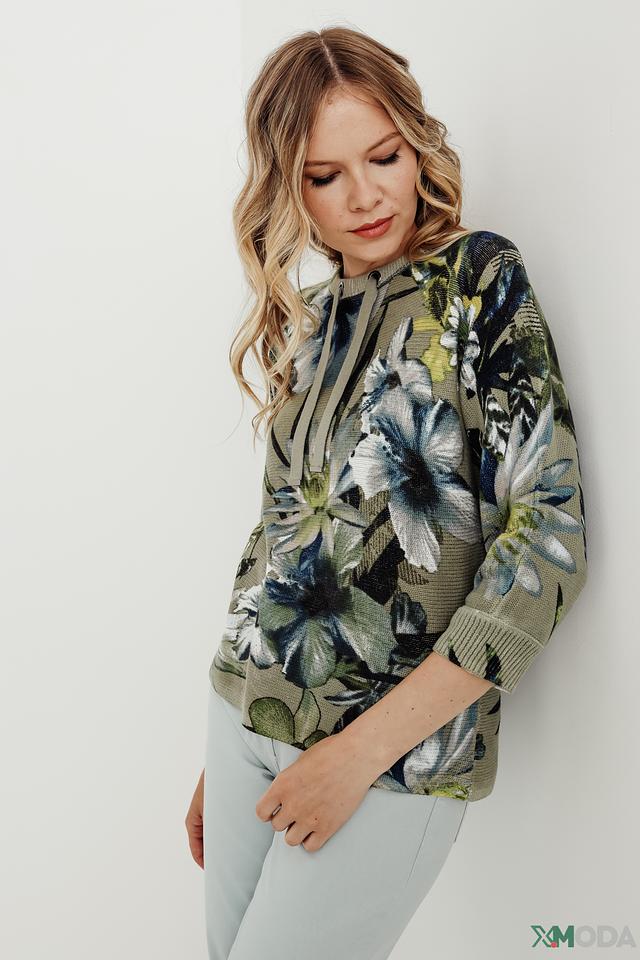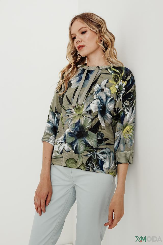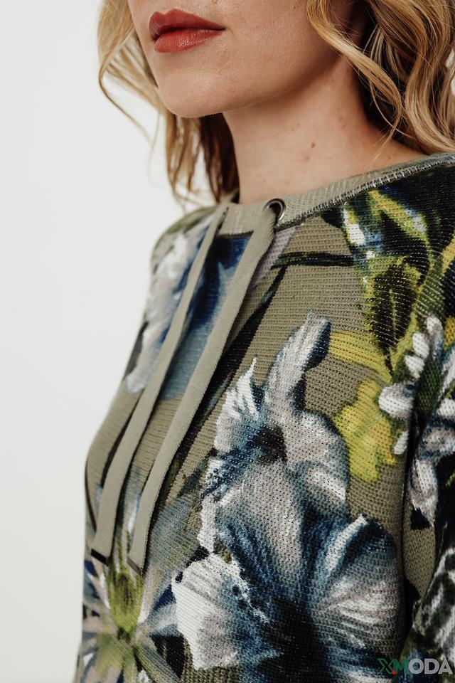 Пуловер имеет оливковый цвет, который служит идеальным фоном для яркого цветочного принта. Дизайн украшен крупными изображениями цветов в синих, зеленых и белых тонах, создавая эффектный и запоминающийся образ.
