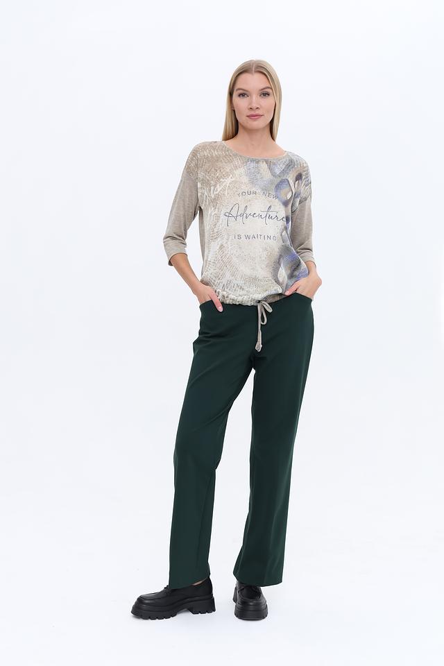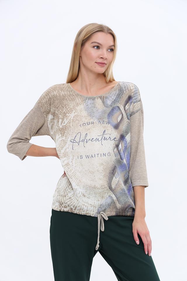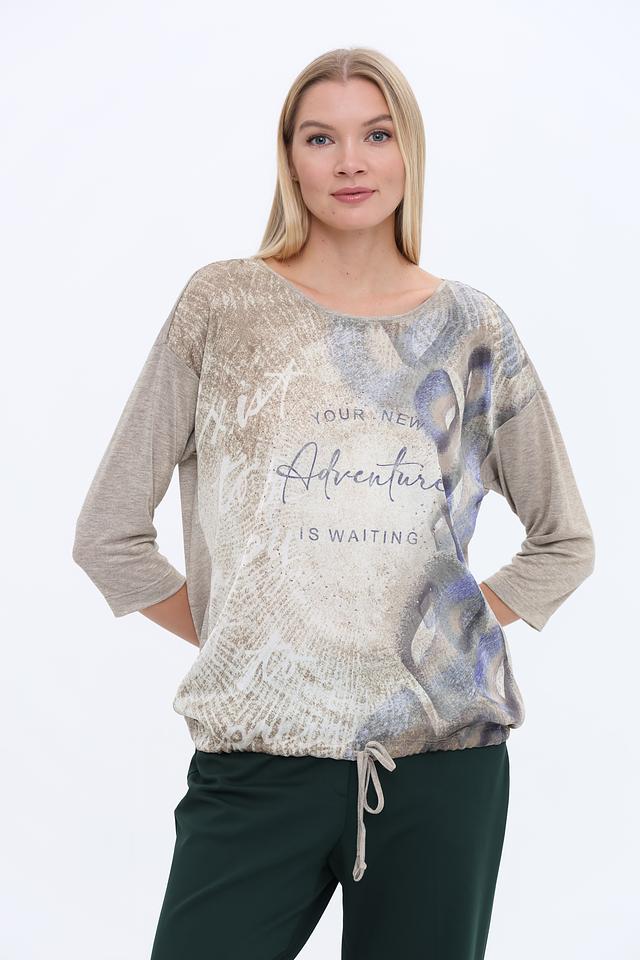 Эта стильная блуза от Bianca выполнена в бежевых тонах и украшена эффектным принтом с надписью "Adventure is waiting". Модель имеет свободный крой, который не сковывает движений и обеспечивает комфорт в течение всего дня.
